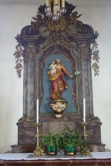 Der Heilige Josef ist nach seinem aus der Bibel überlieferten Beruf als Zimmermann auch der Patron der Arbeiter und der Handwerker, Zimmermänner und Schreiner. Zudem gilt er auch als Schutzpatron der jungfräulichen Menschen, der Ehe und Familie. Meistens ist er als Zimmermann abgebildet mit dem Jesuskind, das ihm hilft. Auf dem linken Seitenaltar der Kirche ist der heilige Josef von einem unbekannten Künstler dargestellt. Hier ist er ein gut gekleideter Mann mit dem Jesuskind, das die Weltkugel in der Hand hält. In der linken Hand hält er einen Lilienstrauß als Zeichen der Reinheit und Keuschheit Marias. Die Statue trägt die Jahreszahl 1686. Die Popularität des Heiligen ist bis heute ungebrochen. Papst Franziskus hat ja auch das vergangene 2021 zum Jahr des heiligen Josef ausgerufen.