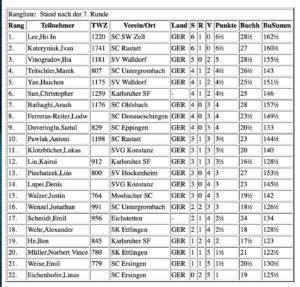 Die Vorentscheidung zum Turniersieg war damit vertagt. Lee blieb aber Tabellenführer und hatte mit der höheren Buchholzwertung die besseren Aussichten auf den Turniersieg. Hieß: Wenn beide die noch zu spielenden Runden am letzten Tag gewinnen würden, wäre Lee Badischer Meister U10. Die Buchholzwertung ist eine verfeinerte Wertung wenn Punktgleichheit besteht. Die Buchholzzahl eines Spielers ist die Summe der Punkte seiner Gegner.
