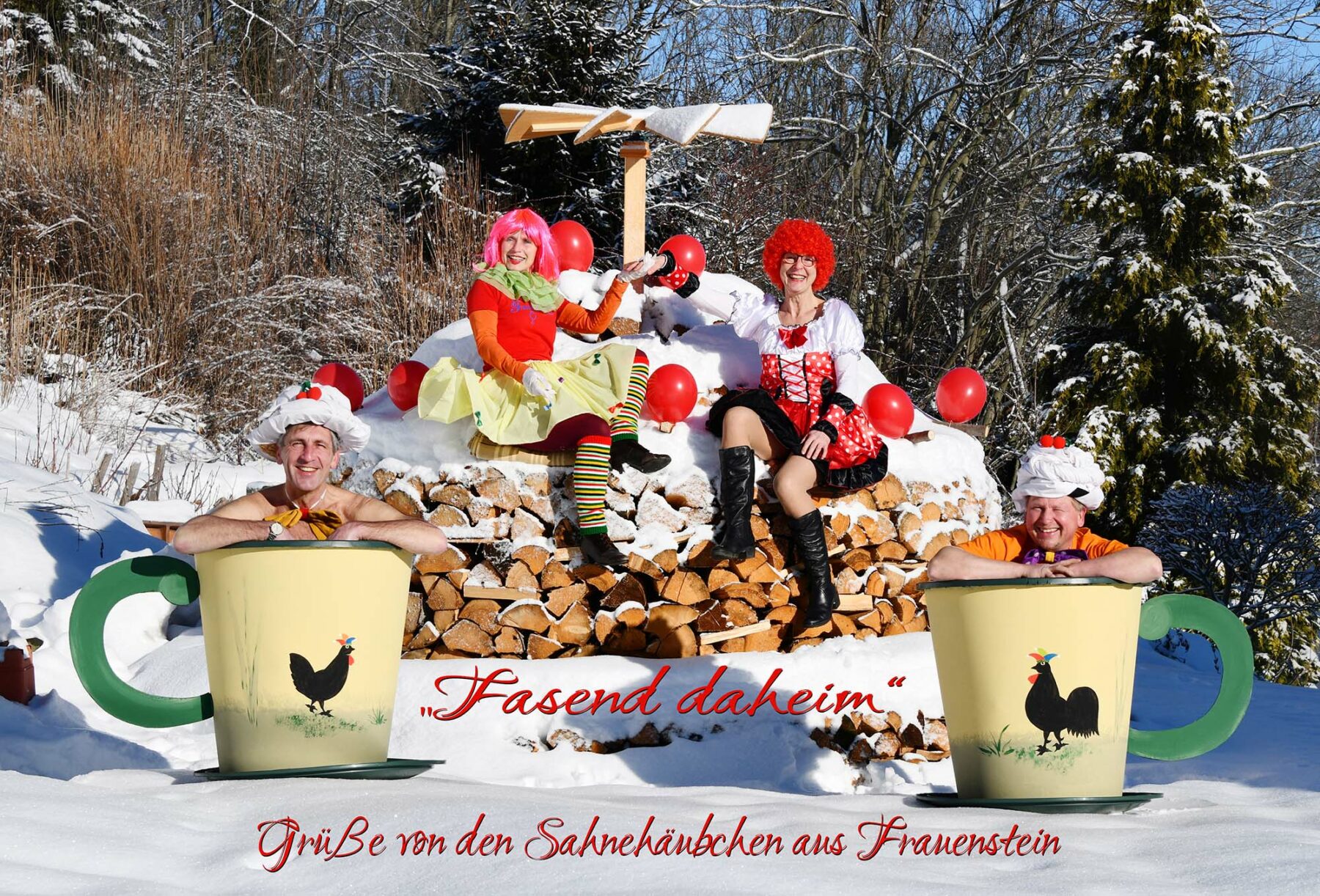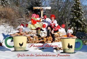 Carla & Gert Köhler und Marina Berndt sowie Steffen Kwak, die Frauensteiner Freunde der Zeller Fasend, feierten die »Fasend daheim« mit, posierten für den Wettbewerb in überdimensionalen Hahn-und-Henne-Tassen beziehungweise auf einem zur Schwarzwälder Kirschtorte umgestalteten Holzhaufen – mit Sahnehäubchen samt Kirschen auf dem Kopf.