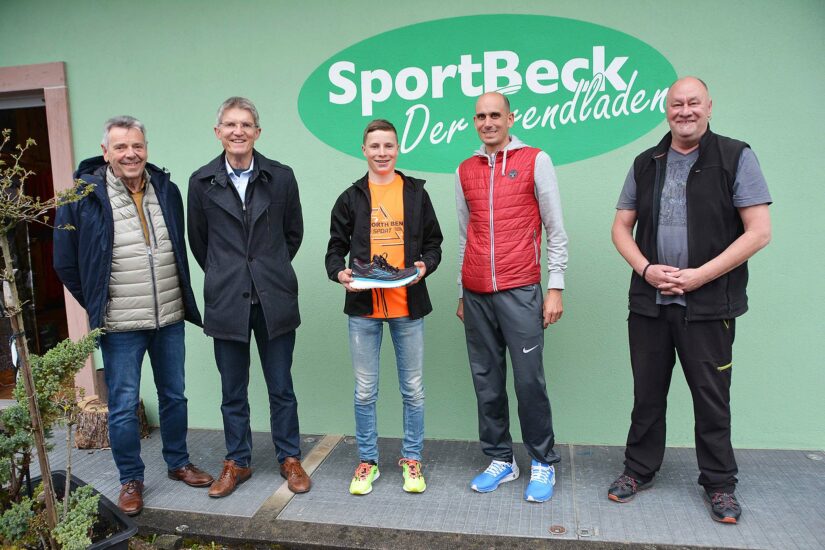 Die Trainingseinheit am vergangenen Freitag in Zell a. H. begann mit einem Besuch bei Sport-Beck in der Turmstraße, wo sich Lukas Ehrle mit neuen Profi-Laufschuhen ausstatten konnte. Dazu gab es ein Laufshirt und eine Jacke. Regelmäßig fördert Inhaber Walter Beck die Spitzenläufer der LG Brandenkopf. Ihm sei es wichtig, der Jugend einen guten Start zu ermöglichen, betonte der Inhaber des Zeller Sportfachgeschäftes. Vereinsvorstand Ludwig Börsig wiederum bedankte sich seitens des Turnvereins für das großzügige Sponsoring.