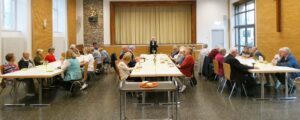 Nach dem besinnlichen Teil ging es dann in das Pfarrheim zum gemütlichen Zusammensein. Josef Stenzel begrüßte herzlich alle Gäste und dankte Bruder Pirmin für die Gestaltung der Maiandacht. Ein Dankeschön galt auch den »Arbeitsbienen« für ihren immer unermüdlichen Einsatz bei der Bewirtung. Ursula Schöner-Müller und Ulla Specken wurden als Neuzugänge imTeam FORUM älterwerden vorgestellt. Danach konnten sich die Seniorinnen und Senioren mit Kaffee und Kuchen sowie erfrischenden Getränken und Brezel stärken und Neues austauschen.