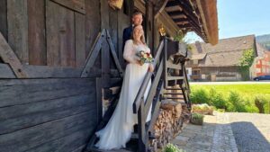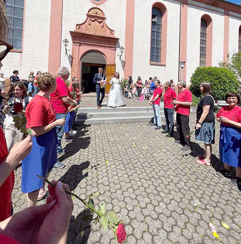 Auch die Kinder des Kindergartens St. Ulrich in Nordrach, in dem Nadine seit 2019 als Erzieherin arbeitet, ließ es sich nicht nehmen, das Brautpaar gebührend zu empfangen. Mit einem einstudierten Schauspiel und Tanz begrüßten sie Nadine und Stefan, als sie aus der Kirche traten.