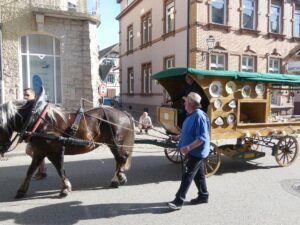 Mittelpunkt des festlichen Aufmarschs war ein vom Oberharmersbacher Wagnermeister Helmut Hug originalgetreu nachgebauter historischer Geschirrwagen. Günter Pfundstein dankte unter anderem ihm, ebenso wie Erwin Junker: Der Inhaber der in Nordrach ansässigen Maschinenfabrik ermöglichte den Nachbau mittels finanzieller Unterstützung. Vor diesem Hintergrund begrüßte der Bürgermeister auch Nicole Weidlich als Prokuristin der Firma Junker.