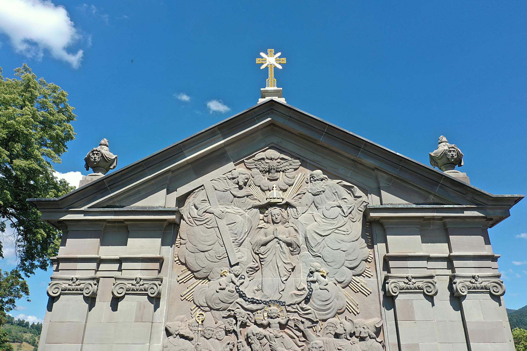 Ende gut, alles gut. Exakt zu Pfingsten konnte das Gerüst an der Vorderfront der Wallfahrtskirche nach zahlreichen Reparaturen und Sicherungen im letzten Vierteljahr entfernt werden. Die vier Störche auf dem Kirchendach genießen ihr neues Heim – noch wohlbehütet von ihren Eltern.