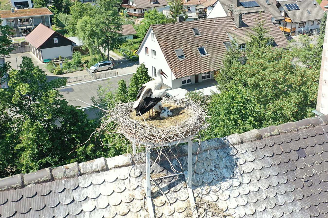 Selbst das Regierungspräsidium wies mit strengem Zeigefinger darauf hin, dass hier auf dem vielbegangenen Dach einer Kirche ein Betreten verboten und eine Verhinderungssperre anzubringen sei. Die Störche schüttelten den Kopf. Aber was half’s?