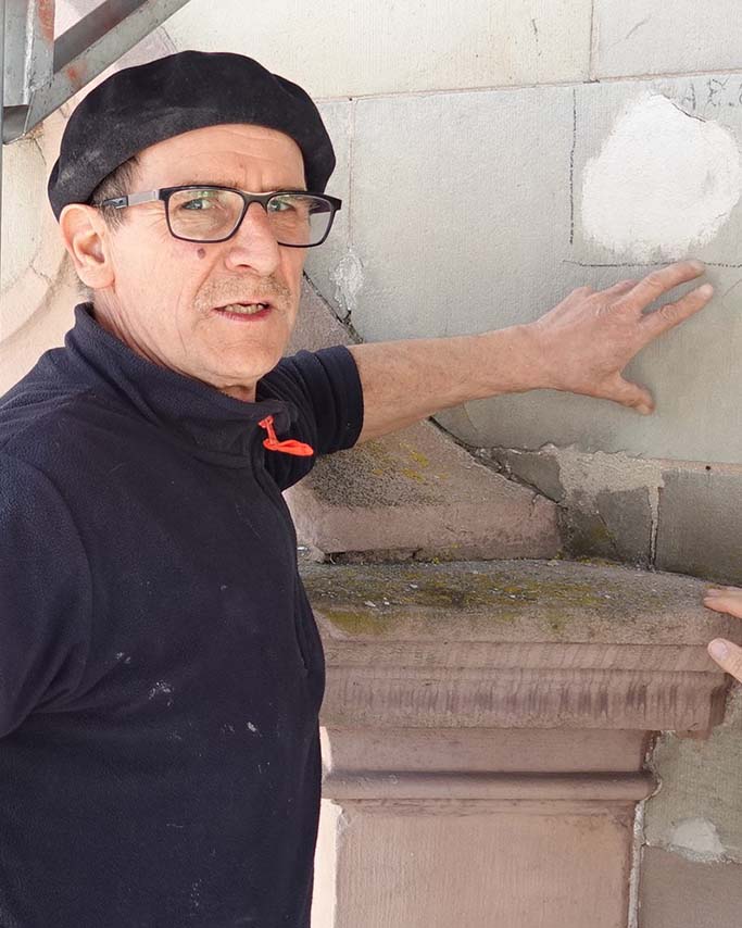 Steinmetz Marco Ohnesorg: »Trotz der langen Zeit sind die Sandsteine in einem hervorragenden Zustand. Sie lassen sich millimetergenau bearbeiten, eventuelle Löcher verschließen. Sie gewähren uns die Sicherheit, dass sie noch lange halten.« Lediglich 14 der Quadersandsteine an der Vorderfront der Portalseite mussten bearbeitet und sorgsam behandelt werden. Marco Ohnesorg: »Schon ein kleiner daumengroßer Steinsplitter könnte beim Herabfallen zu großen Verletzungen führen.«
