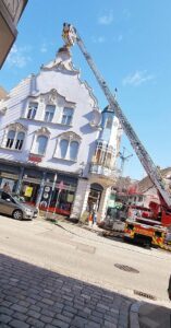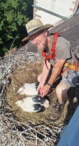 Am vergangenen Mittwoch hat nun die alljährliche Beringungsaktion stattgefunden. »Storchenvater« Gérard Mercier wurde dabei von der Freiwilligen Feuerwehr der Stadt Zell am Harmersbach mit der Drehleiter unterstützt. Mehr als vier Stunden hat die Beringung der Störche in Zell, Biberach, Schwaibach sowie Steinach gedauert. Insgesamt acht Storchennestern wurden angefahren.