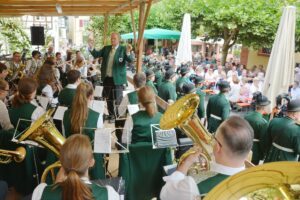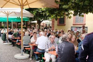 Nach dem Aufmarsch übernehmen die »Zeller Musikanten« das Rahmenprogramm. Sie spielen wie gewohnt unter der Leitung von Robert Maier traditionelle Blasmusik und bekannte Lieder zum Mitschunkeln. Der Kanzleiplatz wird gemütlich hergerichtet sein: mit Schatten spendenden Marktschirmen und einladenden Sitzgelegenheiten. Die Schützenküche liefert kulinarische Spezialitäten und auch flüssige Köstlichkeiten fehlen nicht. Nur eine Kleinigkeit zum Umgewöhnen bleibt nicht erspart. Die Bürgerwehr bittet die Gäste um Selbstbedienung und hoffen auf Verständnis. Bei einem Gläschen Schorle oder Bürgerwehrbowle kann trotzdem wie eh und je geplaudert werden und der neu gewählte Vorstand und Kommandant Andreas Lehmann begrüßen die Gäste, sowohl persönlich als auch von der Bühne aus. Später gibt es DJ-Musik für Jung und Alt zum Schwofen und Schwelgen, mit Möglichkeit in der Torbogenbar unterm Storchenturm einen Absacker zu genießen.