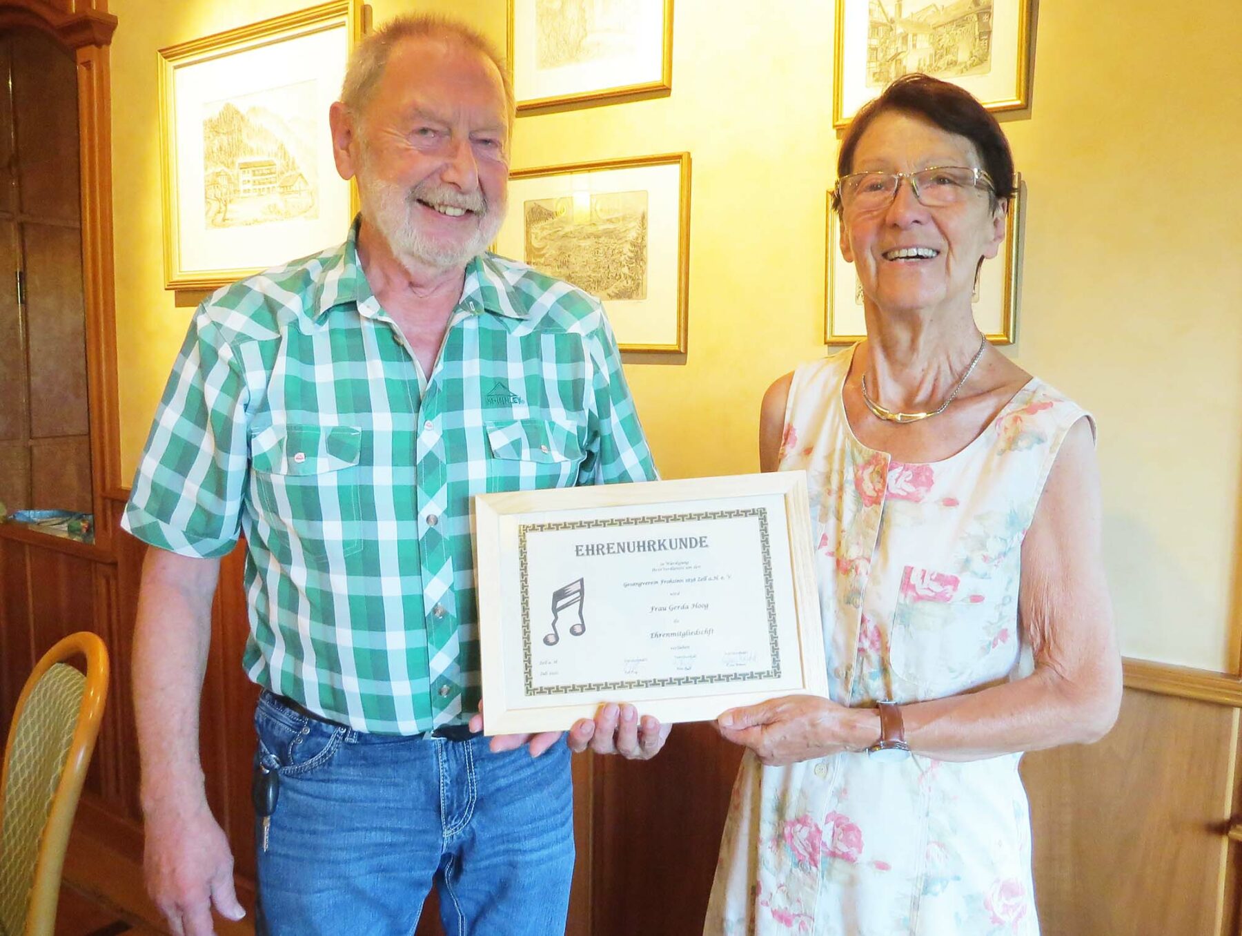 Den Tätigkeitsbericht für das Jahr 2021 trug Hilde Ruff vor. Ein Jahreskonzert konnte coronabedingt nicht stattfinden. Der Chor nahm sich viel Zeit, um die Kameradschaft zu pflegen. Bei Goldenen Hochzeiten, runden Geburtstagen oder geselligen Treffen kommen die Mitglieder gern zusammen und es wird gern gesungen. Im Juli fand eine Schnupperprobe mit der neuen Dirigentin Alexandra Lauer statt. Im September wurde eine Chorleitervereinbarung mit der neuen Dirigentin getroffen. Bei der ersten offiziellen Probe unter ihrem Dirigat merkten die Beteiligten: Es passt mit Alexandra Lauer und dem Chor.