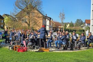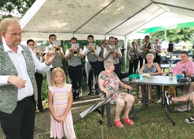 Auf den Balkonen des Altenpflegeheims und an den Fenstern der Betreuten Wohnungen waren die Logenplätze der vielen Zuschauer und -hörer. Auch wenn das Platzkonzert mit einem Platzregen begann, tat das der guten Stimmung keinen Abbruch. Die Musiker und einige Besucher fanden Schutz in zwei Gartenzelten, die im Park des Heimes standen. Nach dem Regen sorgten Mitarbeiter des Seniorenzentrums schnell dafür, dass die Kapellenmitglieder wieder auf ihren Sitzen Platz nehmen konnten. Mit schwungvollen und mitreißenden Stücken füllten die Musiker den Sommerabend und erhielten großen Beifall.