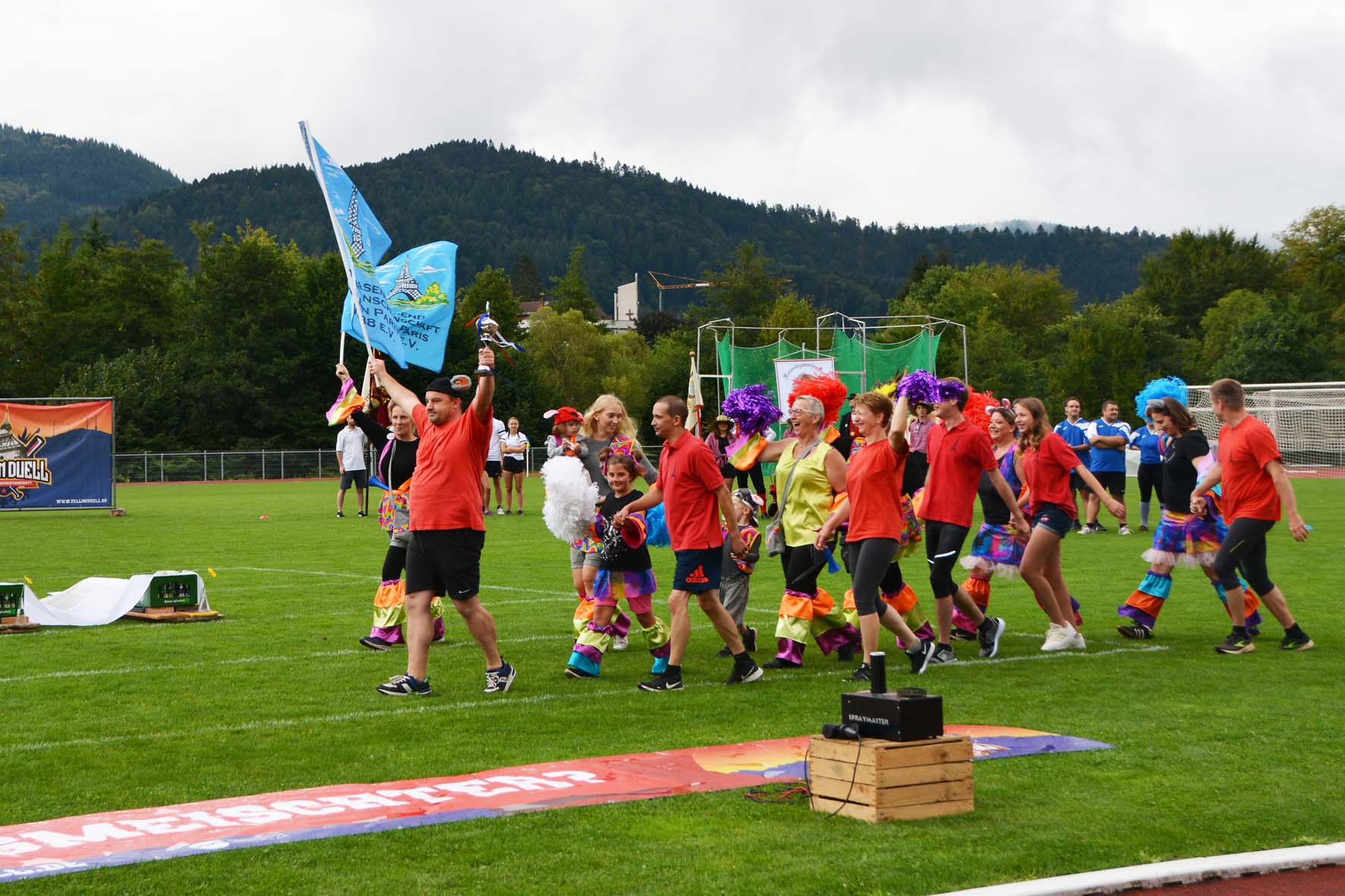 Die Fasendgemeinschaften Klein-Paris und die Spielgemeinschaft von Dörfle und Neuhausen hatten ihre bunten Kostüme und Fahnen aus dem Schrank geholt. Die Bogenschützen zogen als Gefolge von Robin Hood und Bruder Tuck ins Duell. Der Turnverein Zell präsentierte sich zackig in bester Turnvater-Jahn-Manier und schleuderte ihren Glücksbringer Mattis in die Luft fliegen. Hochmotiviert kamen auch der Bundesligist SKCU und die Bürgerwehr aus dem Stadionkeller ins Stadion gestürmt. Der Pfund e.V. hatte auch einen Hund und zwei Pferde mit dabei und blieb damit seinem Vereinsnamen treu. Eine erste Ansage machte gleich zu Beginn die Freiwillige Feuerwehr. Sie fuhr mit Blaulicht und Martinshorn ins Stadion ein und rannte quer über den Rasen zur Mannschaftspräsentation.