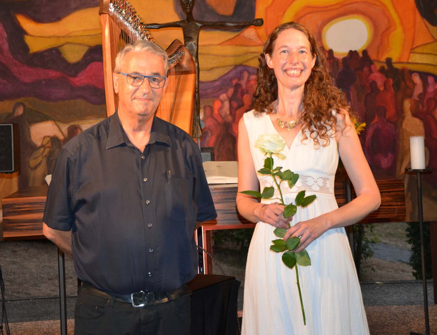 Der reiche Beifall des Publikums mündete schnell in ein rhythmisches Klatschen. Ohne Zugabe wollte man die sympathische Musikerin nicht gehen lassen. Sie fühle sich beim Konzertieren in der Zeller Kirche, gerade im Ambiente des Altarraums, besonders wohl, sagte Nadia Birkenstock, bevor sie noch einmal zur Harfe griff und sich mit »Whispering Woods« musikalisch verabschiedete. Mit auf den Weg nahm sie die weiße »Sommermusik«-Rose, mit Dankesworten überreicht vom Kirchenältesten Joachim Groß.