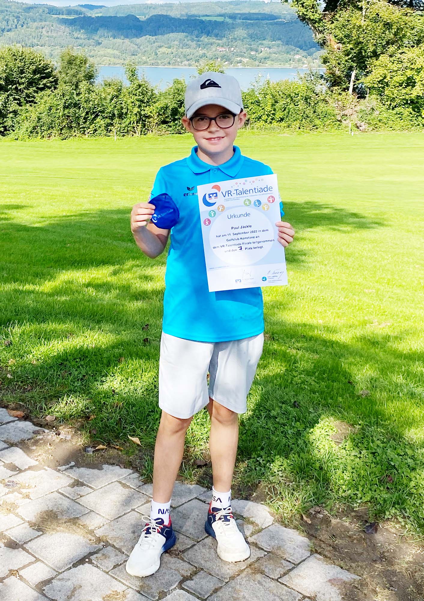 Paul Jäckle hat zur Vorbereitung des Finales in Konstanz einige Stunden auf dem Golfplatz verbracht und sein regelmäßiges Training, unter anderem mit seinem Golftrainer Robbi Weißer (GC Gröbernhof), hat sich bezahlt gemacht. Als jüngster Teilnehmer in seiner Altersklasse (AK11 Jungen) konnte er den 7. Platz erreichen und bei strahlendem Sonnenschein die Urkunde entgegennehmen.