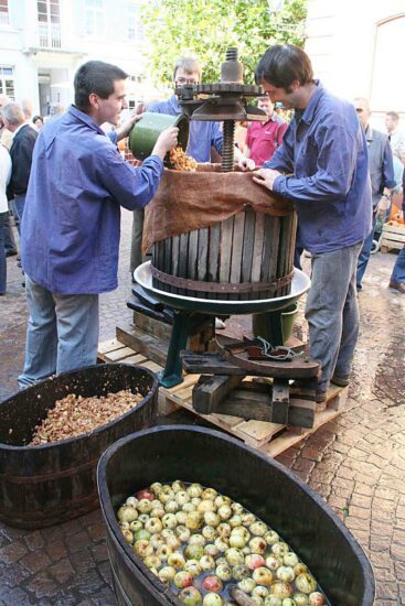 Strahlende Kinderaugen beim Drehen der Mostpresse und die Erkenntnis: Apfelsaft wird tatsächlich aus richti- gen Äpfeln gemacht, kommt nicht aus dem Tetrapack und schmeckt einfach super lecker. Lecker sind auch die Gaumenfreuden, die die »Mostbuebe un Mostmaidle« bereithalten: frischer Apfel- und Zwiebelkuchen, frischgepresster Apfelsaft, letztjähriger Most aus Neuhauser Südhanglage und dieses Jahr ganz neu im Angebot, Apfel-Royal – lassen Sie sich über raschen.