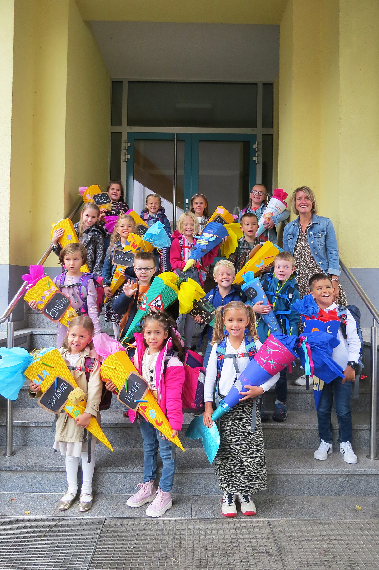 Sie stellte Konrektor Wolfgang Müller-Scharer als für die Grundschule zuständigen Lehrer vor. Er begrüßte ebenfalls die Erstklässler: »Wir habe uns sehr auf euch gefreut. Ich sehe euch im Sportunterricht.« Er stellte die beiden Lehrkräfte vor: Katrin Bolten und Julie Lythje und überreichte zwei Geschenkkartons mit Material für den Unterricht. Dann las er die Namen der Klassenlisten vor und bat die Kinder mit ihren Lehrerinnen, sich auf den Weg in die Grundschule zu machen. Dort stellten sich die Kinder auf der Treppe für das Klassenfoto auf. Und dann – ja, dann ging es wirklich in das Klassenzimmer zur ersten Unterrichtsstunde. Der erste Schultag hat gut angefangen.