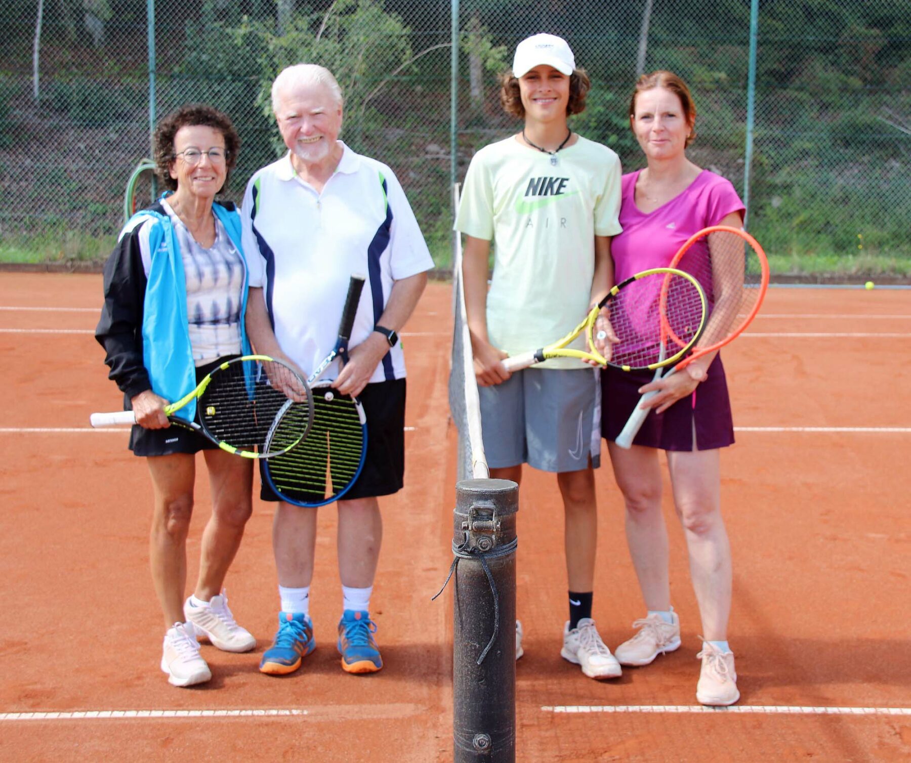 Foto: VereinNachdem Turnierleiter Stephan Manz mit Hilfe der Kinder die beiden 7er-Gruppen ausgelost hatte, brachte Benjamin Künstle beim gemeinsamen Warm-up alle Teilnehmer gehörig ins Schwitzen. Bei der Vielzahl der Spiele ging jede Partie über einen verkürzten Satz bis 4 und ohne Vorteilsregel. Jedes Mixed-Pärchen hatte 6 Matches zu absolvieren. In der 1. Gruppe setzte sich das Ehepaar Anna und Marcus Hug ungeschlagen durch, vor Anita Bürk/Franz Dold, gefolgt von Otti Schwendenmann mit Sohn Manuel. Ebenso eindeutig war das Ergebnis der 2. Gruppe, in der Claudia und Benjamin Künstle die besten waren vor Ute Schwendenmann mit Sohn Jakob, gefolgt von Malia Damm/Lennox Burger. Im Finale, das über einen kompletten Satz ging, zwischen den beiden Ehepaaren Hug und Künstle hatten die Künstles zuerst die Nase vorn, doch die Hugs konnten das Match drehen und siegten 7:5. Für Marcus Hug war der Sieg ein gelungenes Comeback nach jahrelanger Tennis-Abstinenz. Im Spiel um Platz 3 trafen Jakob Schwendenmann mit seiner Mutter Ute auf das Senioren-Mixed Anita Bürk und Franz Dold, beide zusammen 151 Jahre alt. Die Jungen ließen den Alten beim 6:0 keine Chance.