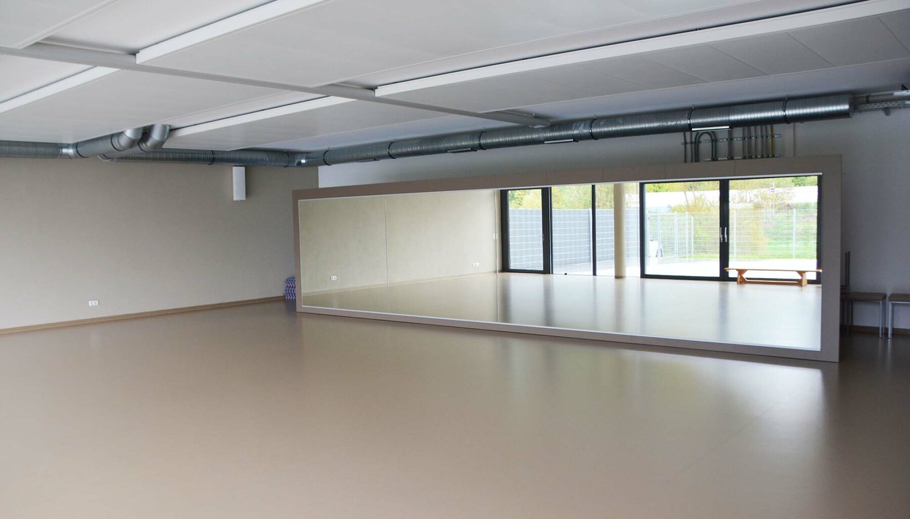 Auch die große Gymnastikhalle verfügt über eine Grundausstattung mit Gymnastikmatten, diversen Bälle oder Faszienrollen. Direkt vor der Halle befindet sich eine große Freiterrasse, die an schönen Tagen ebenfalls genutzt werden kann.
