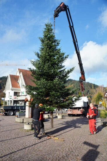 Es weihnachtet sehr: Am heutigen Montag wurden vom Betriebshof die großen Tannenbäume in der Stadt aufgestellt. Einer der Bäume stand in einem privaten Vorgarten und schmückt nun den Stadteingang bei der AOK (Bild). Drei Bäume wurden beim Penny-Markt entlang der Unterentersbacher Straße gefällt und auf die weiteren Plätze verteilt. Foto: Hanspeter Schwendemann