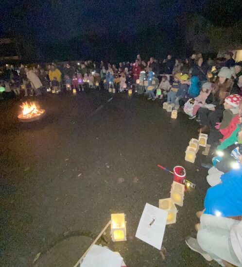 Zurück auf dem Schulhof des SBBZ brannte das Feuer und die Kinder wurden von ihren Eltern erwartet. Dort spielten die Kinder die Geschichte des St. Martin und die Schulanfänger sangen als Chor für alle das Lied »Lichterkinder«.