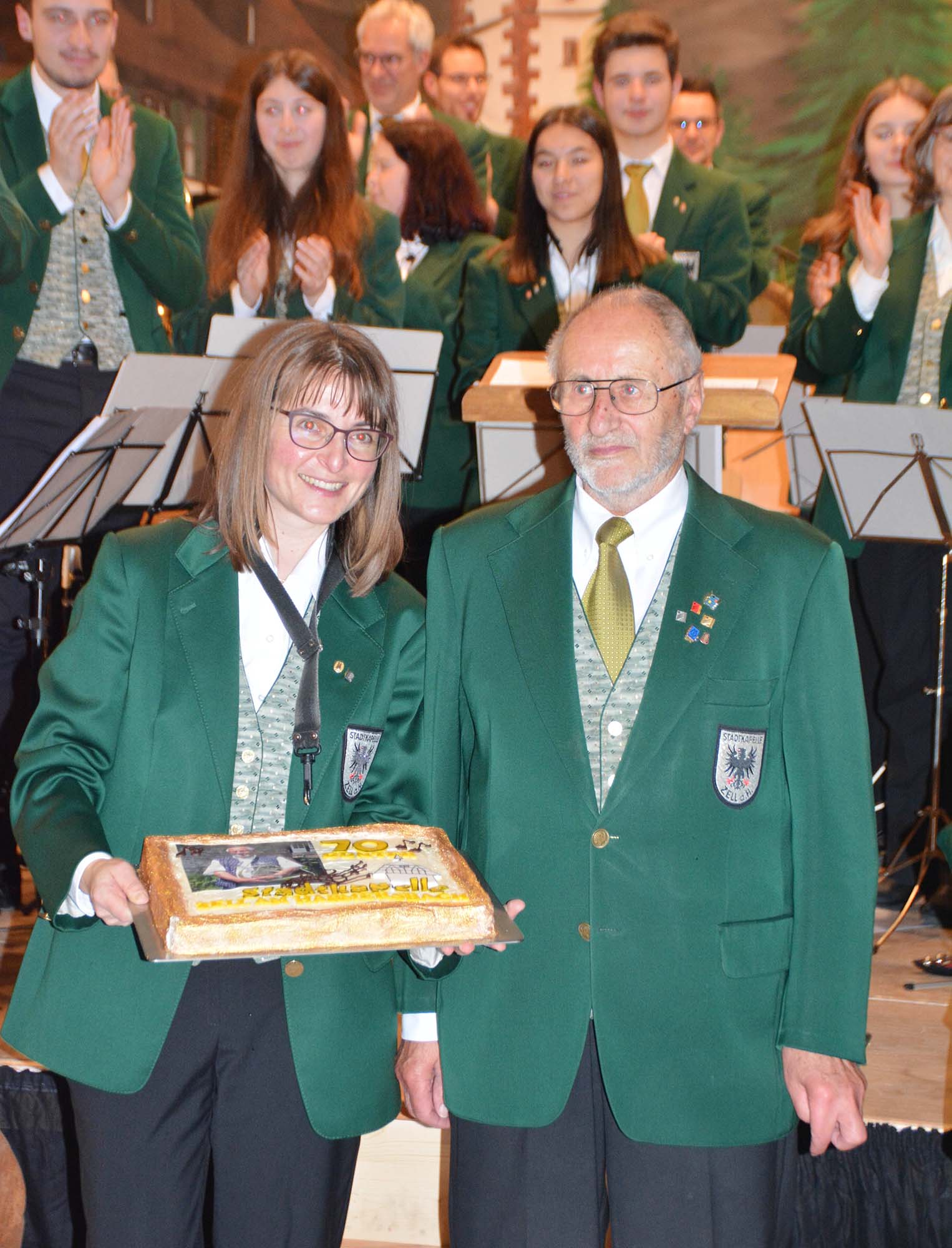 17 Jahre war der »Gutzele-Günter« zudem als Beisitzer im Vorstand tätig und sechs Jahre als Dirigent. Den Spitznamen habe Günter Lehmann erhalten, weil er stets Bonbons für die jungen Musiker bereithielt, erklärte Grillich. Unter viel Beifall des Publikums in der Ritter von Buß-Halle wurde dem Liebhaber von Süßspeisen eine »persönliche Torte« überreicht.