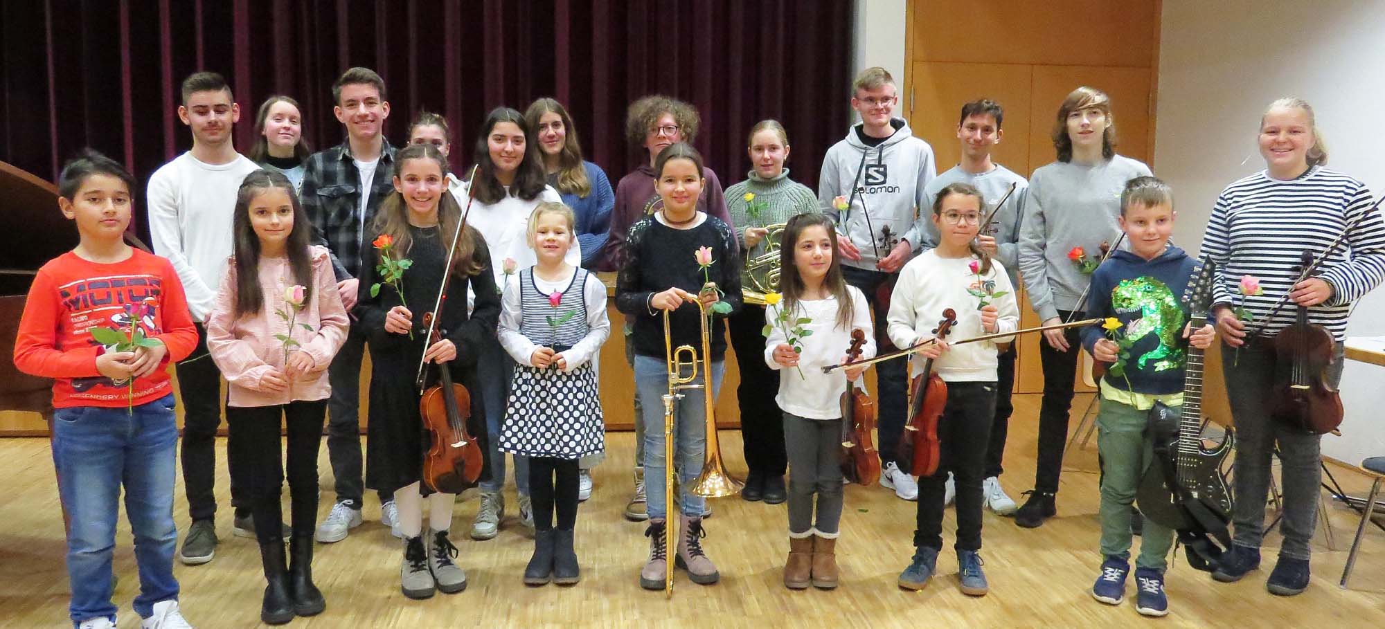 Es musizierten 20 Schülerinnen und Schüler aus den Klassen von Beate Fisseler (Violine), Alex Geladze (Klavier), Stefan Polap (Flügelhorn, Posaune, Horn), Barbara Schell (Klavier) und Heike Thoma (Querflöte).