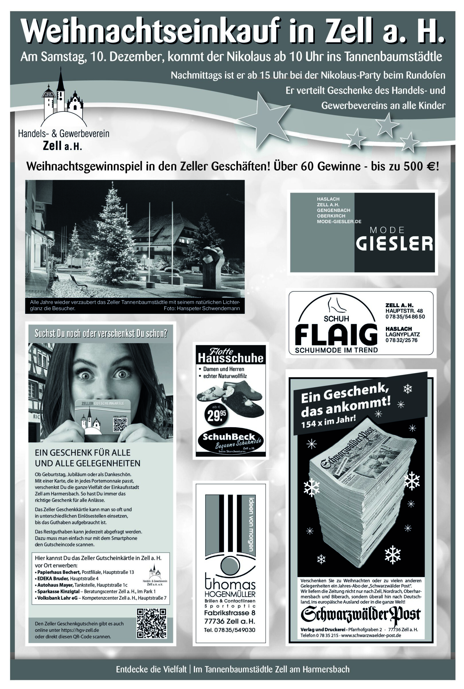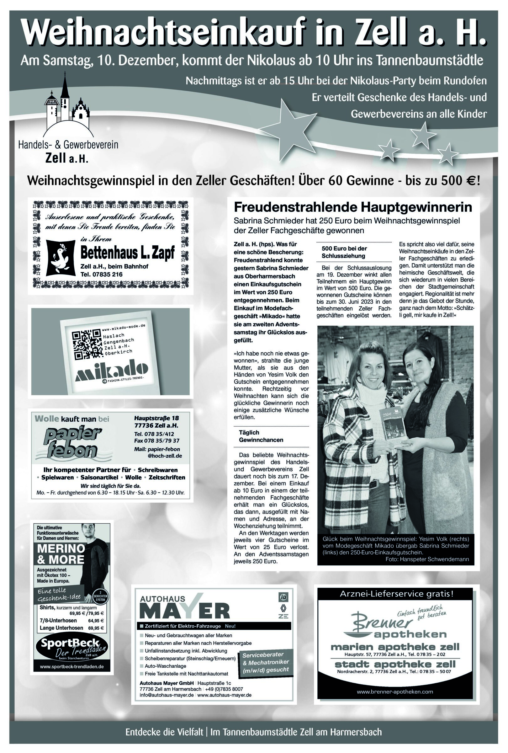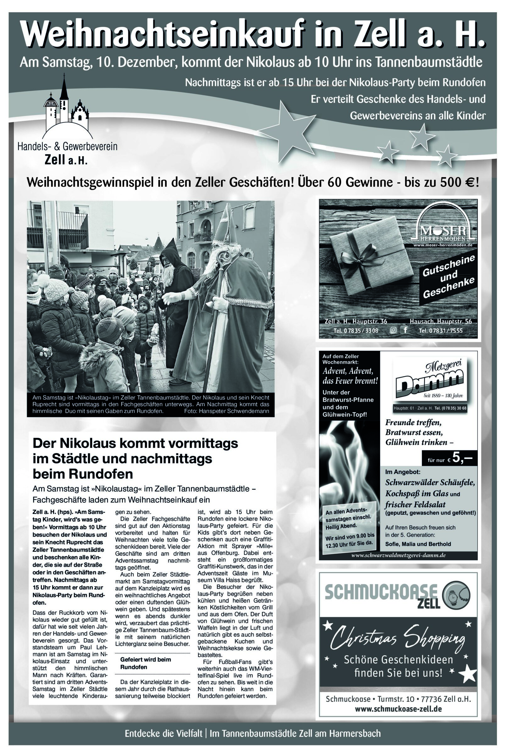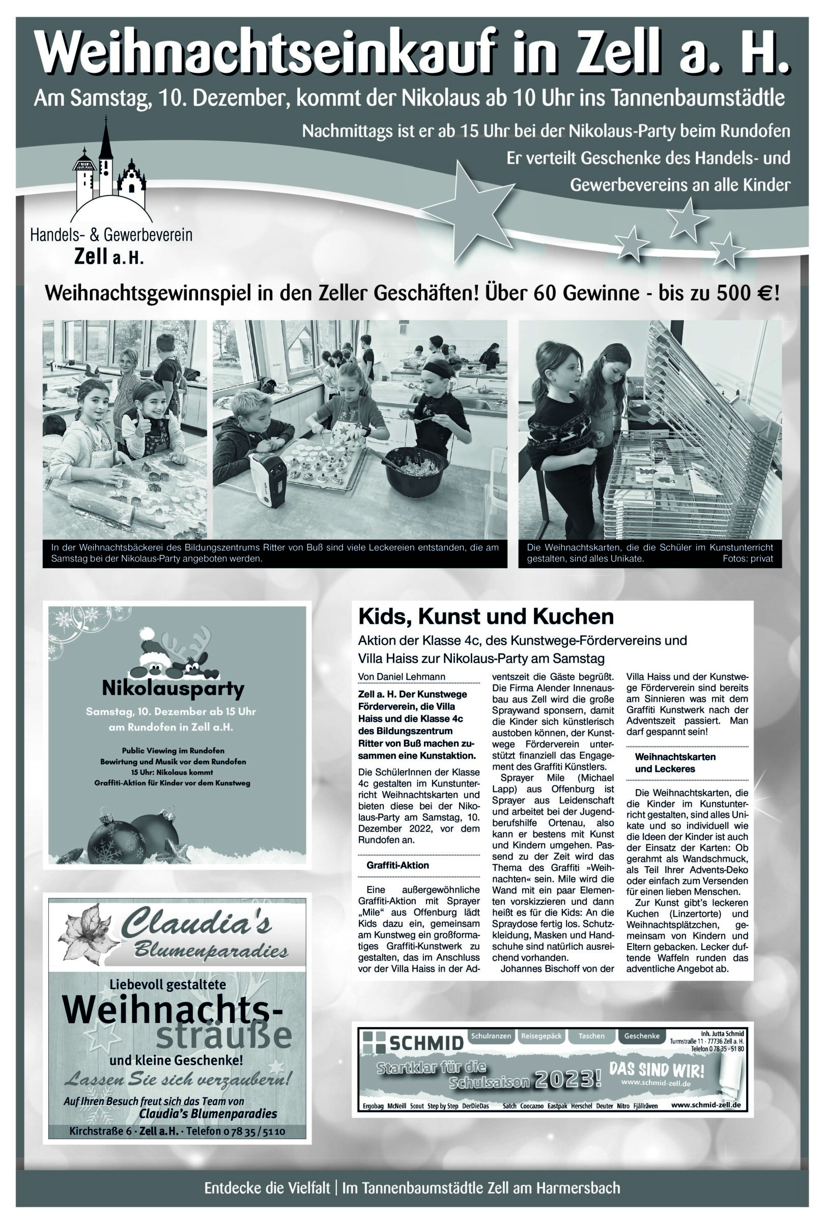 - Anzeige -Zell am Harmersbach | 7.12.2022 Weihnachtseinkauf in Zell a. H.Am Samstag, 10. Dezember, kommt der Nikolaus ab 10 Uhr ins Tannenbaumstädtle Foto:In der Weihnachtsbäckerei des Bildungszentrums Ritter von Buß sind viele Leckereien entstanden, die am Samstag bei der Nikolaus-Party angeboten werden. Foto: privat von Schwarzwälder PostDer Kunstwege Förderverein, die Villa Haiss und die Klasse 4c des Bildungszentrum Ritter von Buß machen zusammen eine Kunstaktion. Foto: Schwarzwälder Post Foto: Schwarzwälder Post Foto: Schwarzwälder Post Foto: Schwarzwälder PostDas könnte Sie auch interessieren:Foto: Hanspeter SchwendemannDas bewundernswerte Lebenswerk von…Foto: Sabine Herm / Udo Müller44. Hallenturnier des BSC Zell wurde…Foto: Jochen KreßChristmas-Wahrheitskugel-App programmiert…