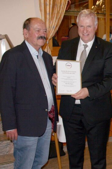 Bevor Grafmüller auf die kommunalen Maßnahmen zu sprechen kam, begrüßte er Hans-Peter Wagner und seine Partnerin Traudel Siner. Grafmüller gratulierte Wagner zu seiner 50-jährigen Mitgliedschaft in der CDU. Zusammen mit einer Urkunde und einem Weinpräsent dankte er dem ehemaligen Vorsitzenden des Ortschaftsrates Unterharmersbach und langjährigen Mitglied des CDU-Stadtrats für sein unermüdliches Engagement. In diesem Zusammenhang dankte auch Bürgermeister Pfundstein Herrn Wagner für die ausgezeichnete Zusammenarbeit bei der schwierigen Sanierung der Hauptstraße im Ortsteil Unterharmersbach.