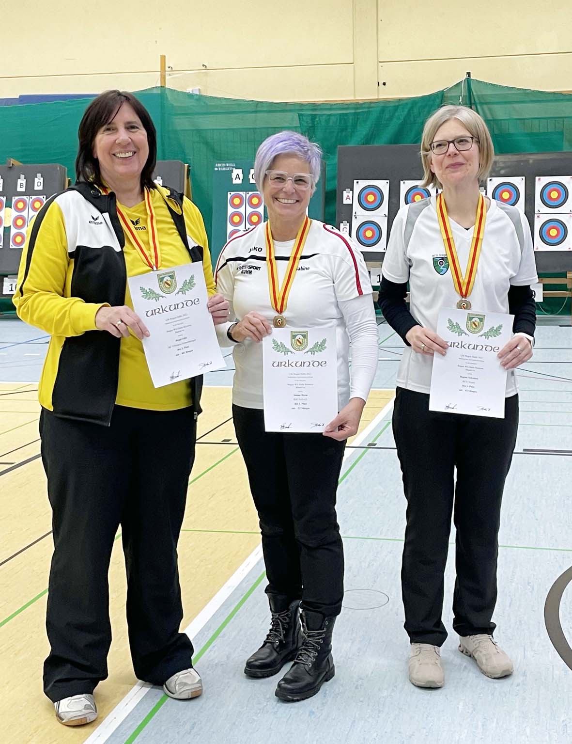 In der Masterklasse Damen Recurve gab es ein freudiges Wiedersehen. Nach so langer Pause freute man sich auf viele bekannte Gesichter. Hier setzte sich Sabine Herm im ersten Wettkampf direkt auf Rang eins, den sie auch im zweiten für sich entscheiden konnte, somit wurde sie mit 517 Ringe Landesmeisterin.