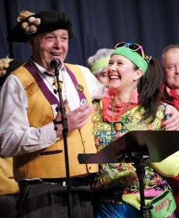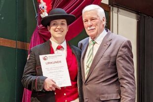 33 Jahre hat Susi Dangl (rechts) die Tanzauftritte beim Zunftabend choreografiert. Die Auftritte am Freitag waren ihre Abschlussvorstellung. Als Zeichen des Danks gab’s von Zunftmeister Clemens Halter (links) einen närrischen Blumenstrauß.