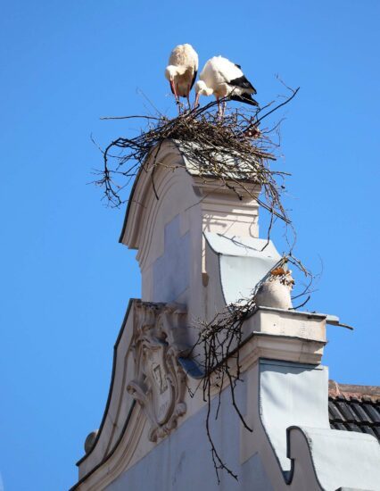 Seit wenigen Tagen richtet sich ein Storchenpaar wieder häuslich auf dem „Keilbach“-Gebäude ein und ist fest mit dem Nestbau beschäftigt.
