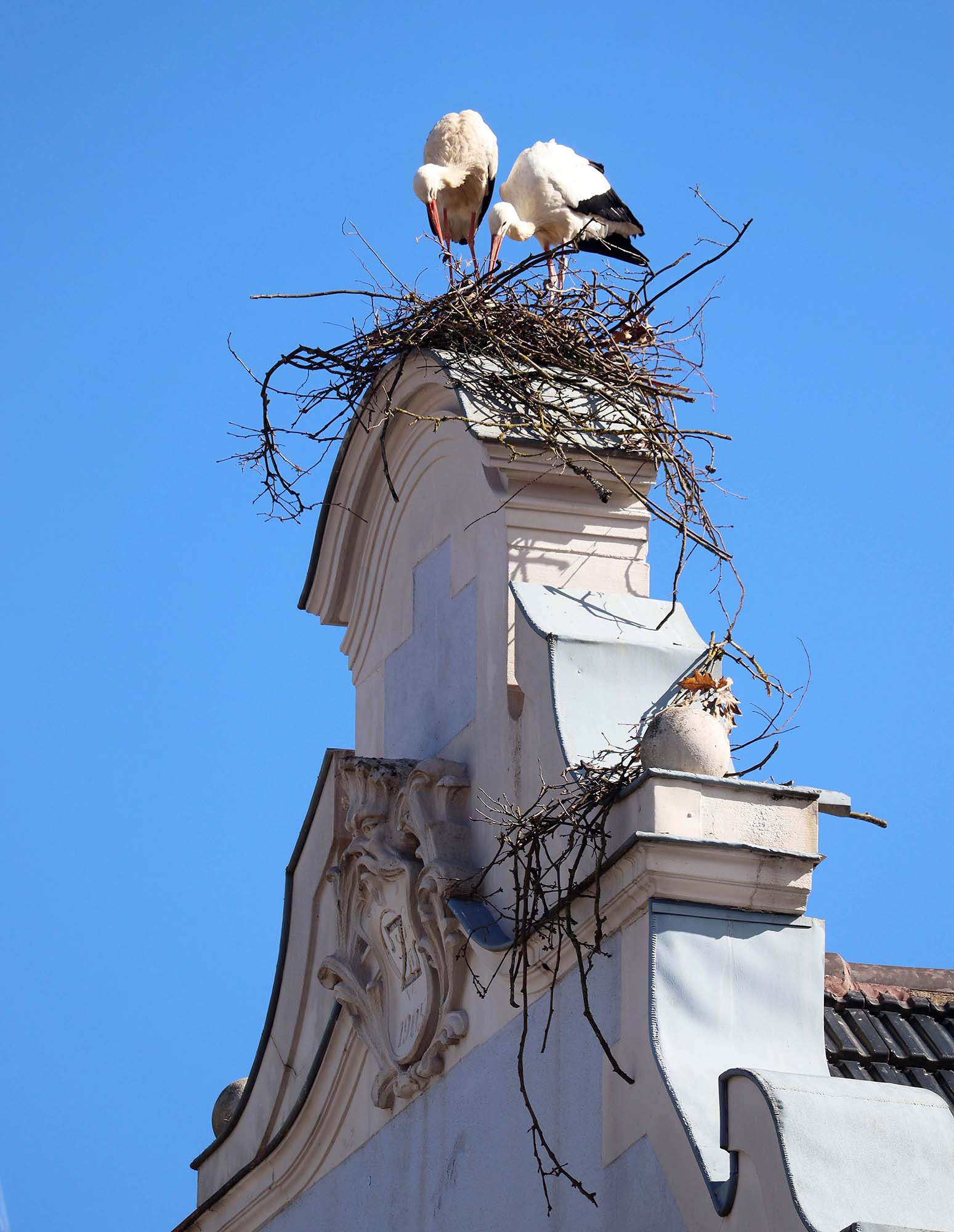 Das Material dafür sammeln die Störche im nahegelegenen Stadtpark. Die dort vom Sturm heruntergefallenen Äste sind das perfekte Baumaterial, das im Schnabel zum Nest auf dem Jugendstilgebäude im Zeller Städtle transportiert wird. Die Störche scheinen die 1-A-Lage und den Umtrieb im Zeller Städtle zu mögen. Selbst beim Bürgerwehr-Salutschuss zur Bürgermeisterwahl am Sonntagabend zuckten sie nicht mal zusammen.