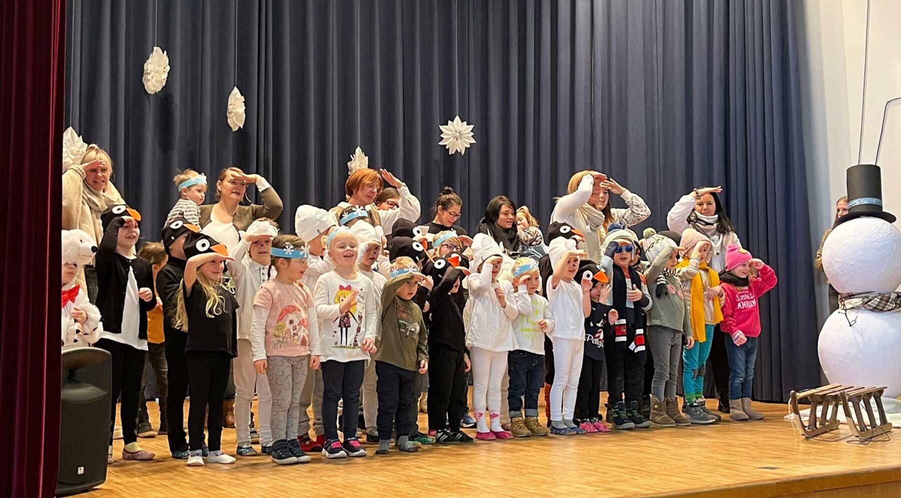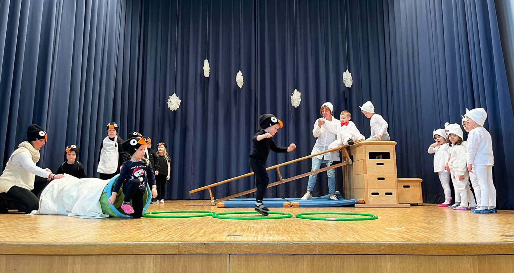 Danach hüpften die Schneeflocken der Sternengruppe über die Bühne und wirbelten fröhlich durcheinander. Den Abschluss des Programmes machte die Sonnengruppe mit einer fröhlichen Turneinlage. Pinguine und Eisbären zeigten hierbei ihr Talent.