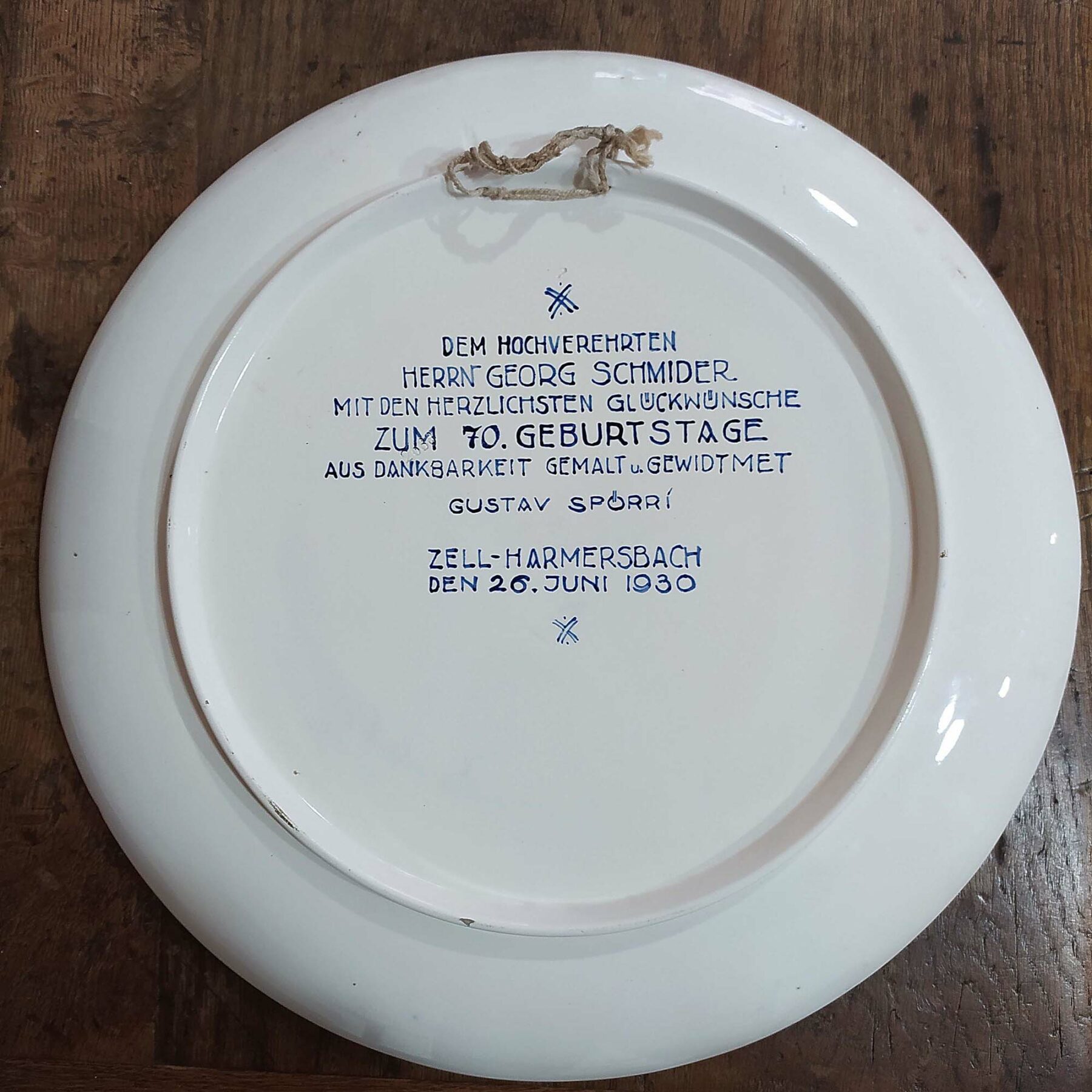 Anmerkung: Ein »Spörri-Teller« mit Widmung auf der Rückseite als Geschenk an G. Schmider zum 70. Geburtstag, kann im Museum am Storchenturm betrachtet werden.