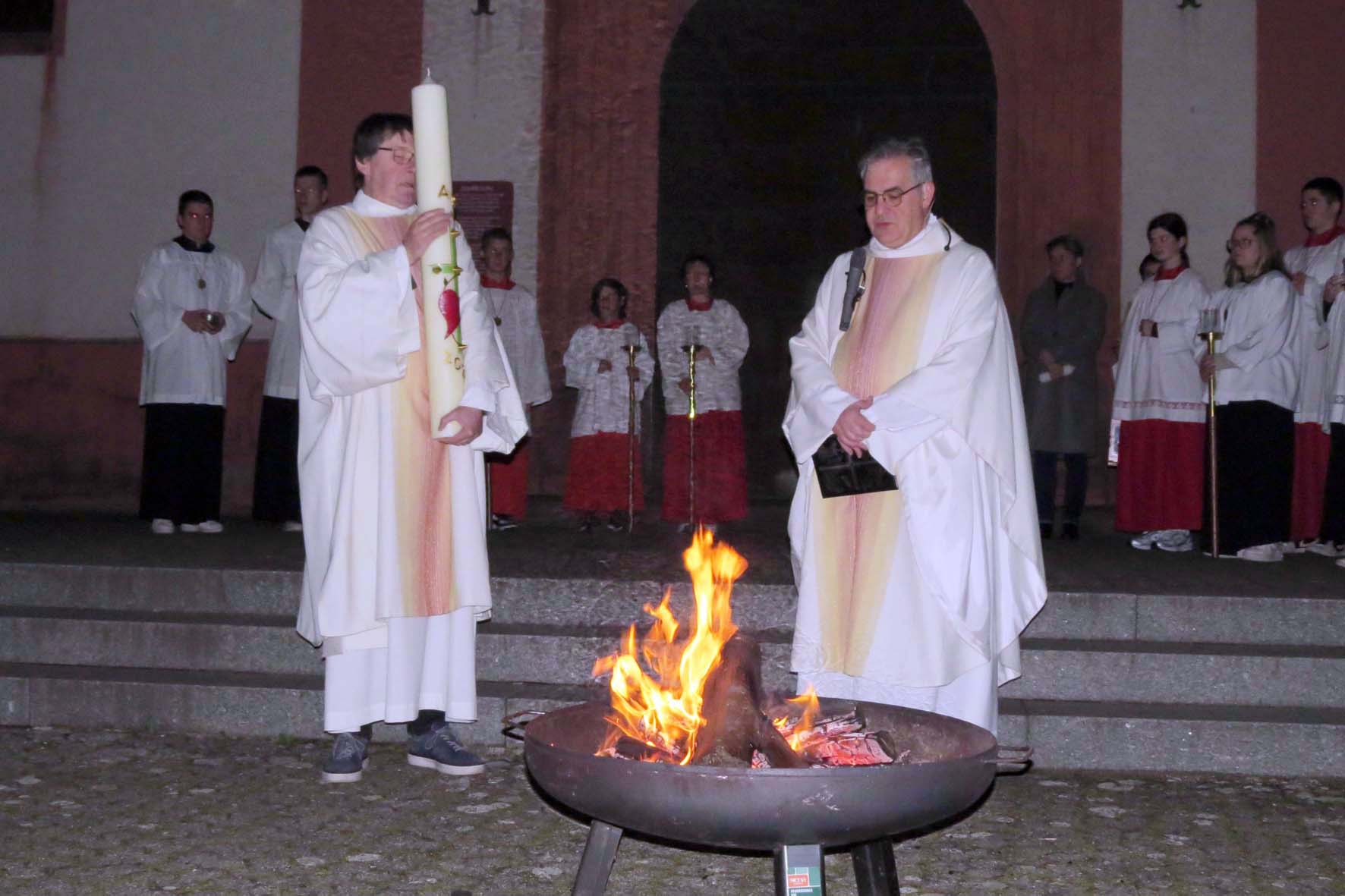 Die Gläubigen versammelten sich schon lange vor 6 Uhr auf dem Kirchplatz, um die schöne Atmosphäre am Osterfeuer in der dunklen Nacht zu erleben. Viele Familien der diesjährigen Kommunionkinder waren dabei. Pfarrer Gerner und Diakon Bruder Pirmin kamen mit einer großen Schar Ministranten und Lektoren auf den Kirchplatz. Pfarrer Gerner segnete das Feuer und die große Osterkerze und entzündete die Kerze mit einer Flamme aus dem Feuer.
