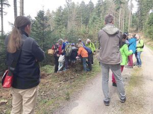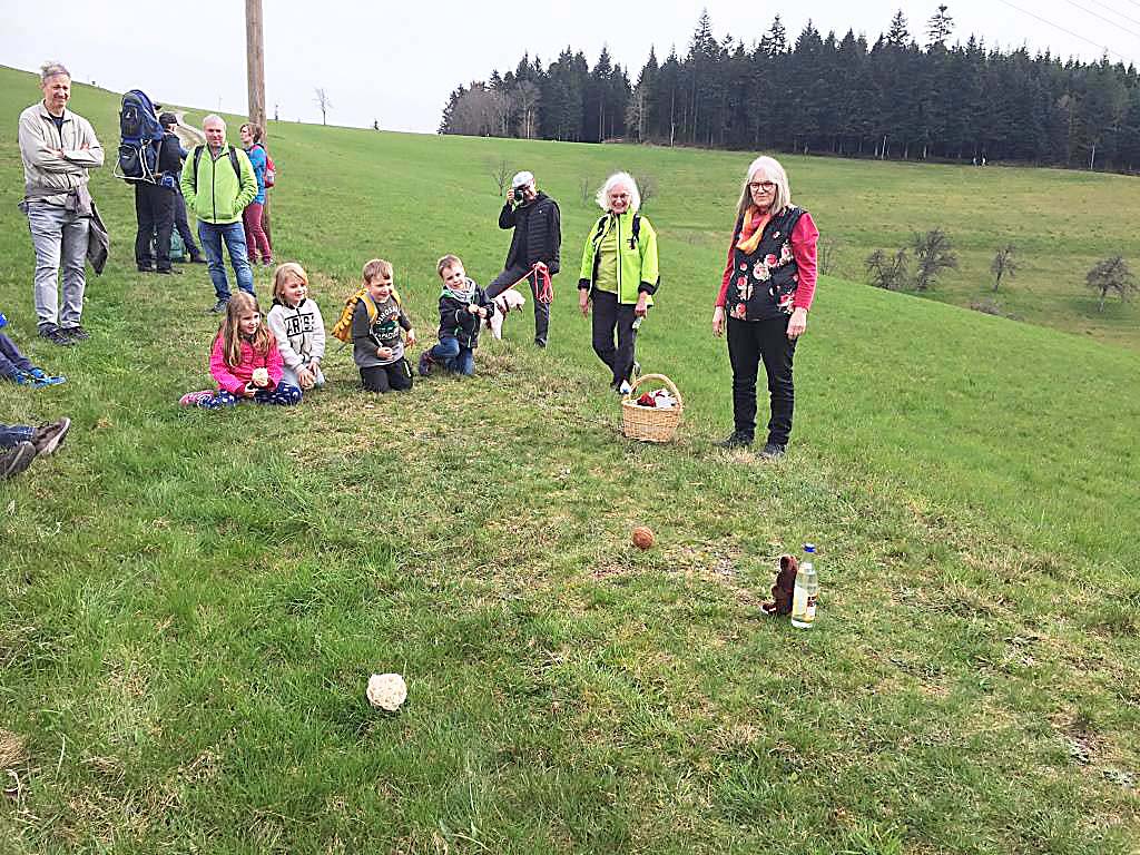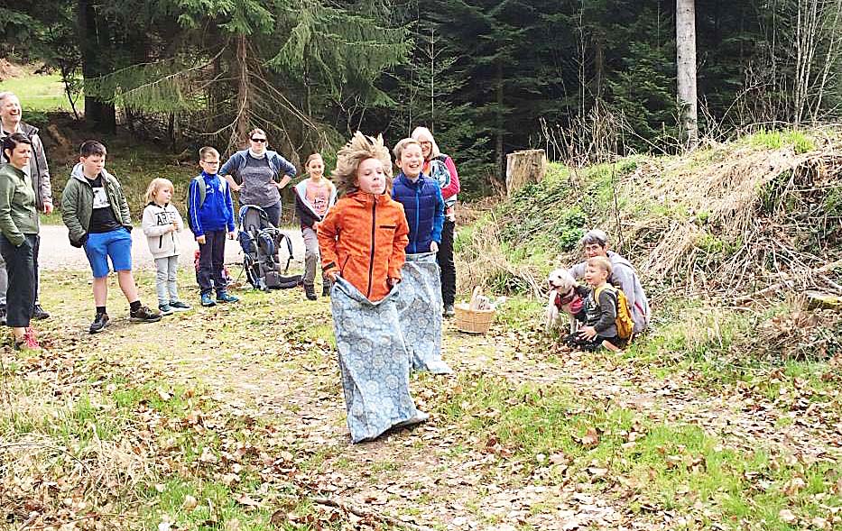 Zu Beginn durfte jedes Kind Eichhörnchen sein und eine Walnuss verstecken. Außerdem gab es noch jeweils eine kleine Tüte zum Erbsen sammeln, denn für jedes typische Osterwort, für jeden unterwegs aufgefundenen Gegenstand und für erfolgreiches Abschneiden oder die Teilnahme an Aktionen gab es eine Erbse. Gespannt, voller Vorfreude und aufmerksam startete die Wanderung. Bei jedem gelben Band an einem Baum wartete eine Spielstation. Und schon nach dem ersten steilen Anstieg durften sich Klein und Groß einen Miniosterhasen aus einer Eidose nehmen. Kurz darauf musste bei der ersten Station das angeschnürte Ei nach gewürfelter Sechs schnell vor dem Fangen gerettet werden. Beim zweiten Stopp folgte Sackhüpfen in extra dafür genähten blaugemusterten Säcken für große und kleine Hasjäger. Teils unermüdlich und federleicht hüpfend wurde um Erbsen gehoppelt. Bei der dritten Station wurde die Mitmachgeschichte der Hühner »Zick« und »Zack« vorgelesen. Es folgten ein bocciaähnliches Hasenspiel und ein typischer Löffel-Eierlauf. Zurück beim Ausgangspunkt sollte dann die Walnuss wieder gefunden und ausgebuddelt werden. Der Sieger mit 41 gesammelten Erbsen erhielt einen frisch gebackenen Hasen, bevor alle Kinder abschließend ihr Osternest suchten. Zur Stärkung wurden noch Apfelsaft und Kuchen für alle angeboten.