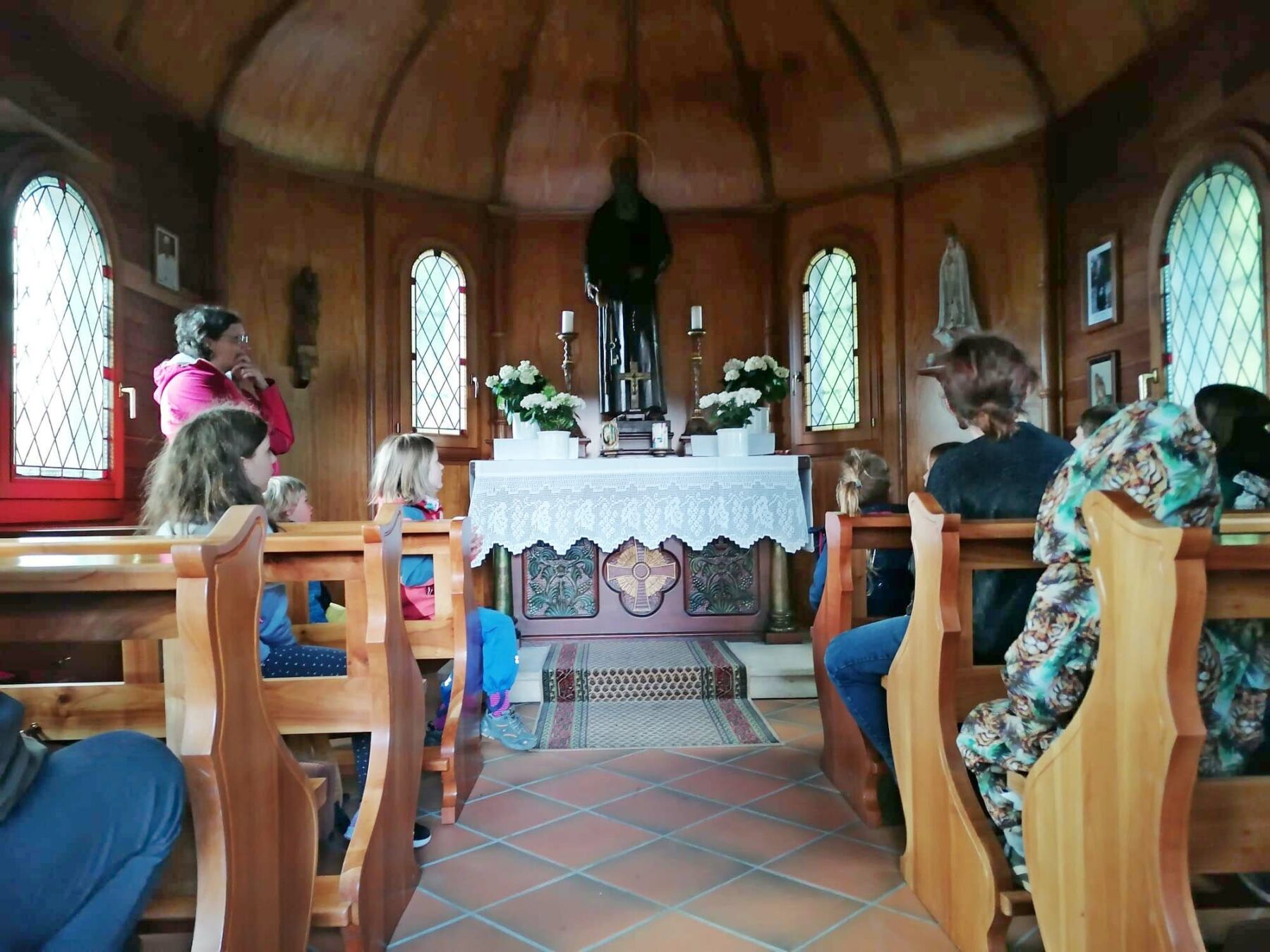 Die Werte „Schutz“ und „Geborgenheit“ sind eng mit Maria, der Mutter Gottes, verbunden, die in der Andacht die Hauptrolle spielte. So wurden Marienlieder gesungen und das Pilgerheiligtum für Kinder gezeigt und erklärt. Anschließend gab es allerhand Wissenswertes über die verschiedenen Mariendarstellungen in der Konradskapelle zu erfahren. So staunten die Kinder nicht schlecht über das schwarze Gesicht einer Darstellung. Es wurde gemutmaßt: Liegt es am dunklen Holz, aus dem die Marienfigur geschnitzt wurde? Oder ist der Ruß der Kerzen, die zu Ehren der Maria entzündet werden, Grund der Verfärbungen?