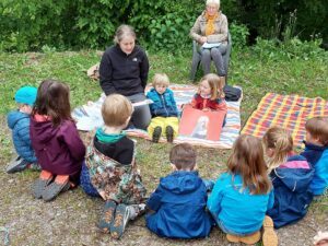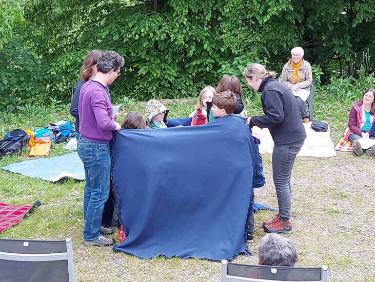Oben auf der Wiese neben der Kapelle wurden die Blumensträußchen vom Wegesrand in die Mitte gelegt und die Picknickdecken ausgebreitet. Mit Glockengeläut stimmten sich alle auf die Andacht ein, die das Kinderkirchen-Team vorbereitet hatte.