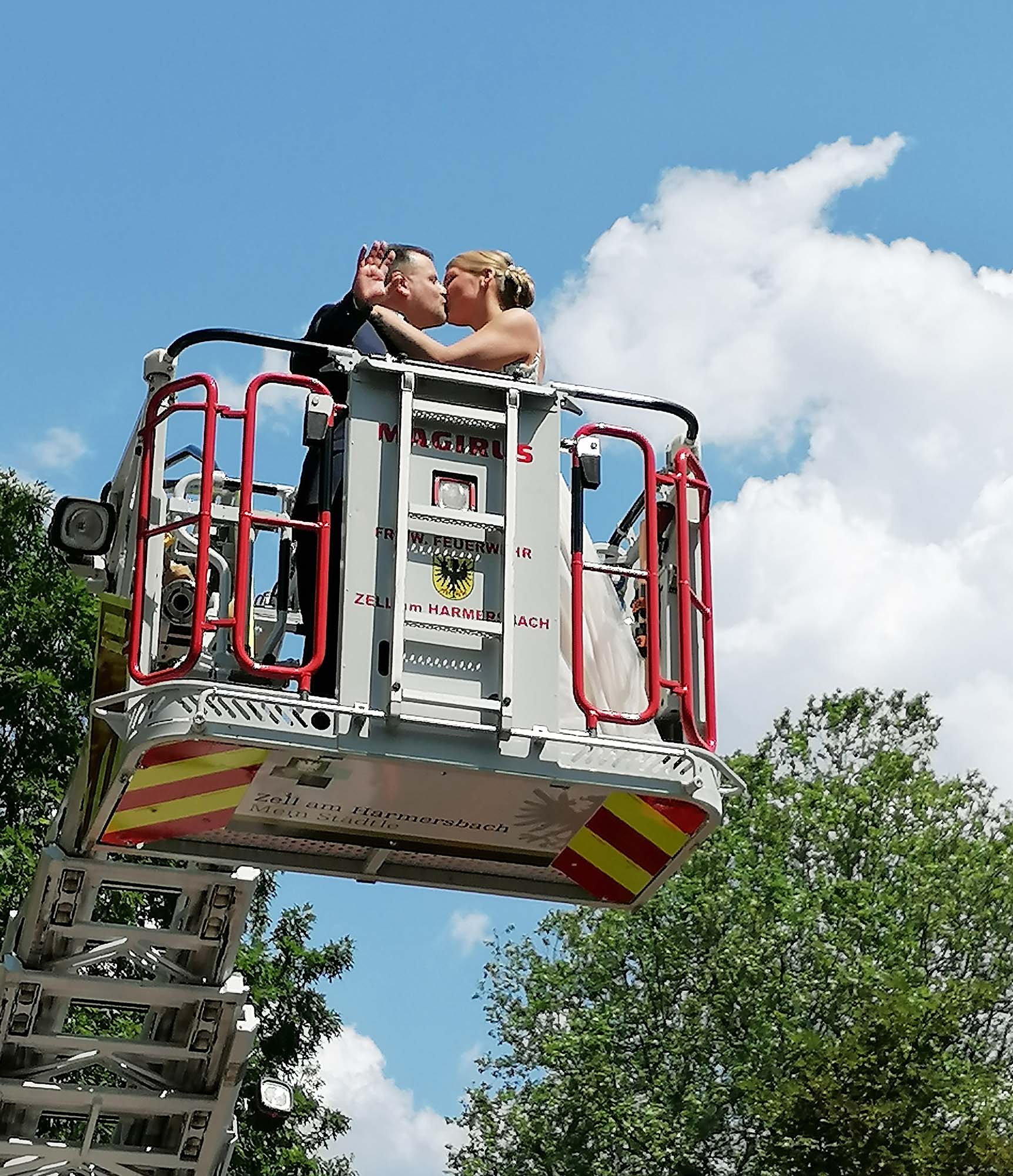 Robert Bergmann ist seit vielen Jahren bei der Zeller Feuerwehr und seine Kameraden ließen es sich nicht nehmen, Mariana und Robert in der Drehleiter in den 7. Himmel zu fahren. Beim anschließenden Sekt empfang mit Freunden und Verwandten wurden viele Glückwünsche ausgesprochen, denen sich die „Schwarz wälder Post“ gerne anschließt.