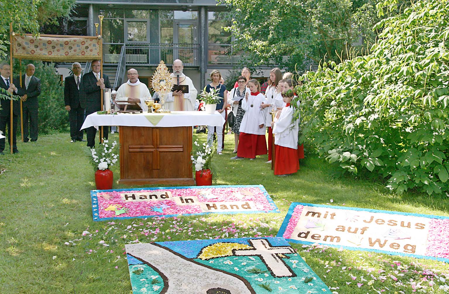 Erinnerung an den Fronleichnamstag im Jahr 2018. Die Kapuziner feierten noch mit und der Altar war im Park vor dem Gallusheim aufgebaut. Dorthin führt die Prozession auch am Donnerstag. Erstmals ist der Altar vor dem neuen Gebäude aufgebaut. Foto: Archivfoto: Dieter Petri