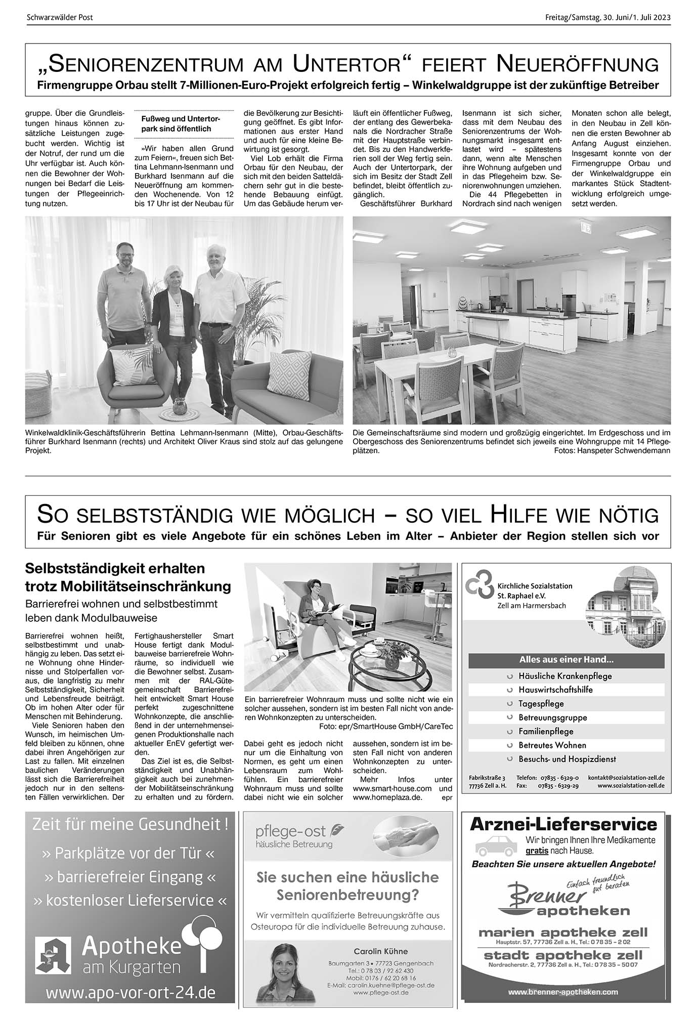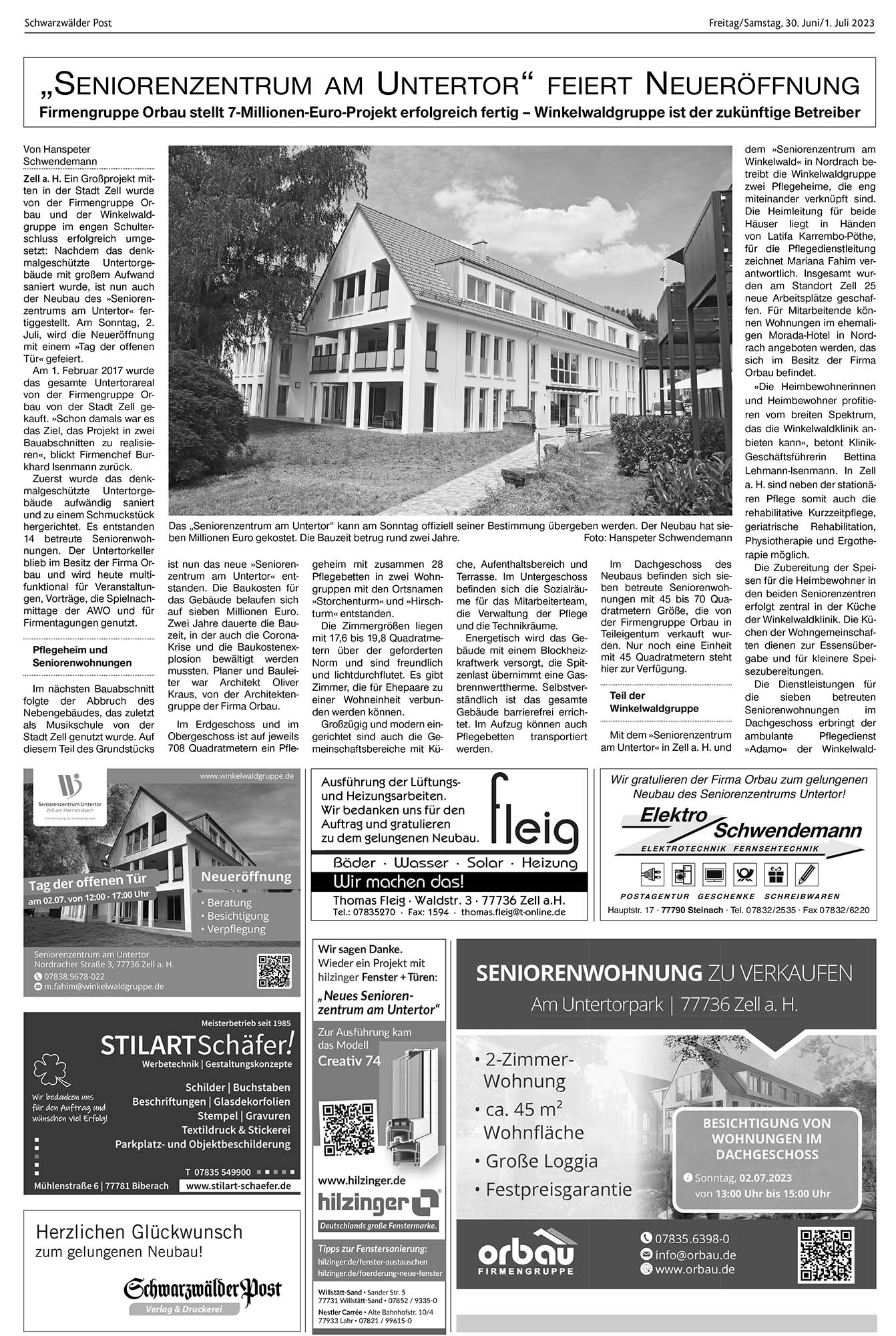 Zell am Harmersbach | 30.06.2023 „Seniorenzetrum am Untertor“ feiert Neueröffnung Foto: Foto: Hanspeter Schwendemann von Hanspeter SchwendemannFirmengruppe Orbau stellt 7-Millionen-Euro-Projekt erfolgreich fertig – Winkelwaldgruppe ist der zukünftige Betreiber Foto: Hanspeter Schwendemann Foto: Hanspeter SchwendemannDas könnte Sie auch interessieren:Foto: Hanspeter SchwendemannEine Ära im Gasthaus „Adler“ geht zu EndeFoto: Lehmann-ArchivKaum Lücken im VeranstaltungskalenderFoto: Wilfried WeisChorverband Kinzigtal feiert 125 Jahre mit…