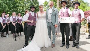 Natalie, die im Musikverein das Horn spielt, durfte den Taktstock übernehmen und Michael im Takt auf die Pauke hauen. Florian Berger überreichte dem Brautpaar mit