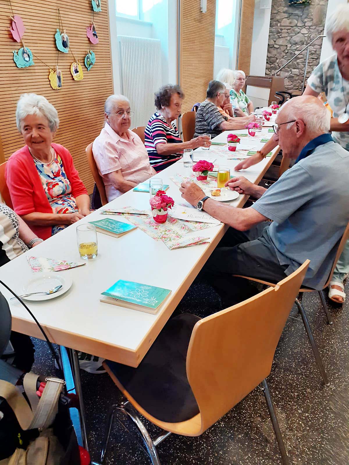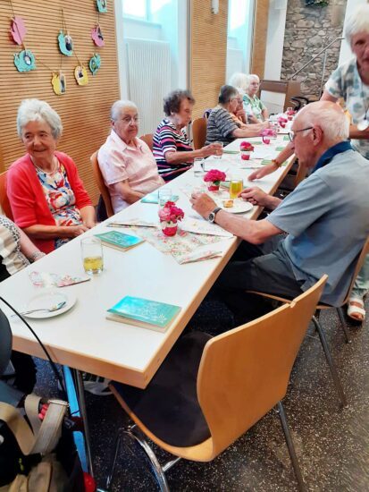 Unter dem Eindruck der wunderschönen Dekoration genossen die Senior*innen Kaffee und Erdbeerschnitte bei anregenden Gesprächen.