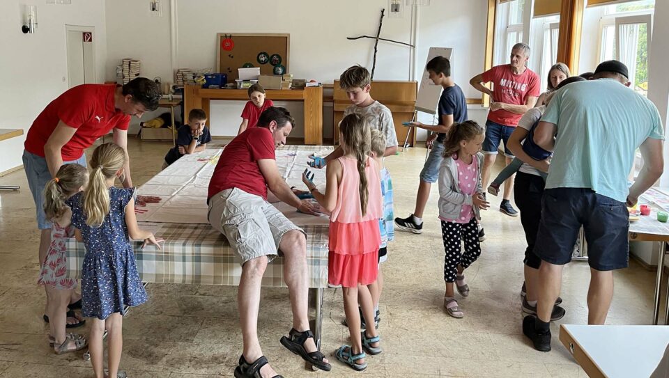 Nach Zusammenkunft und Begrüßung im Gemeindesaal ging es gleich los mit der ersten Aktivität. Die Mitglieder jeder Familie verewigten sich mit farbigen Handabdrücken auf einem großen Tuch. Danach ging es bei bestem Wetter im Kurpark weiter. Das Kids-Treff Team hatte dort weitere Stationen aufgebaut, in denen es um Treffsicherheit, das Überwinden eines Parcours, das Balancieren von Luftballons, den Bau eines Hauses aus Holzstücken oder das Ausschneiden einer Menschenkette ging. Für alle Stationen und Aktivitäten galt, dass die Aufgaben nur durch gemeinsames Handeln aller Familienmitglieder bewältigt werden konnten.