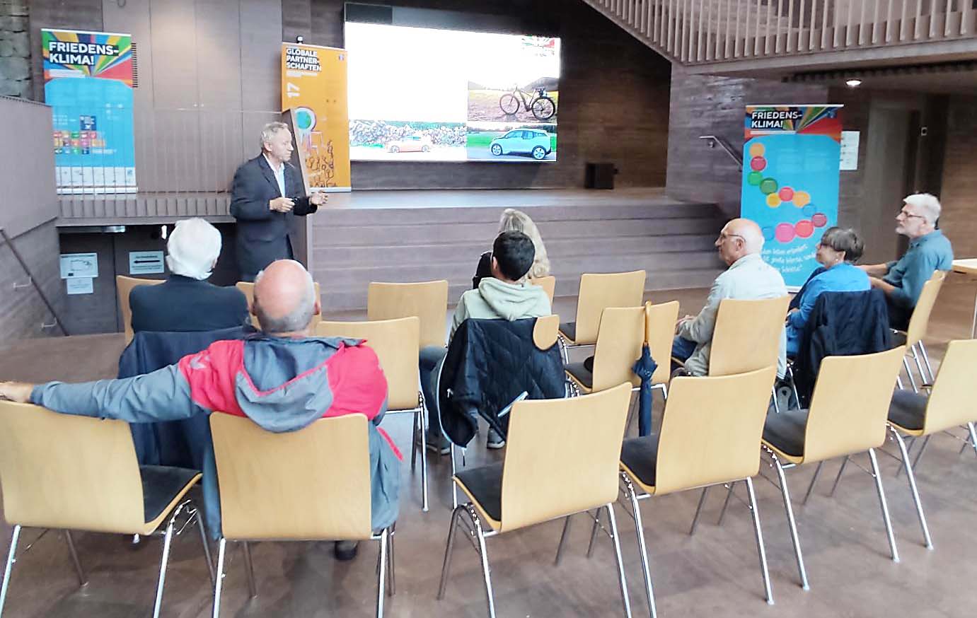 Der Diplom-Ingenieur Gerhard Neumaier hat einen Vortrag zum Thema „Das E-Auto als Zukunftsmodell“ im Rahmen der „Friedensklima!“ Ausstellung gehalten. Es ging um Chancen und Herausforderungen der Elektroauto-Technologie.