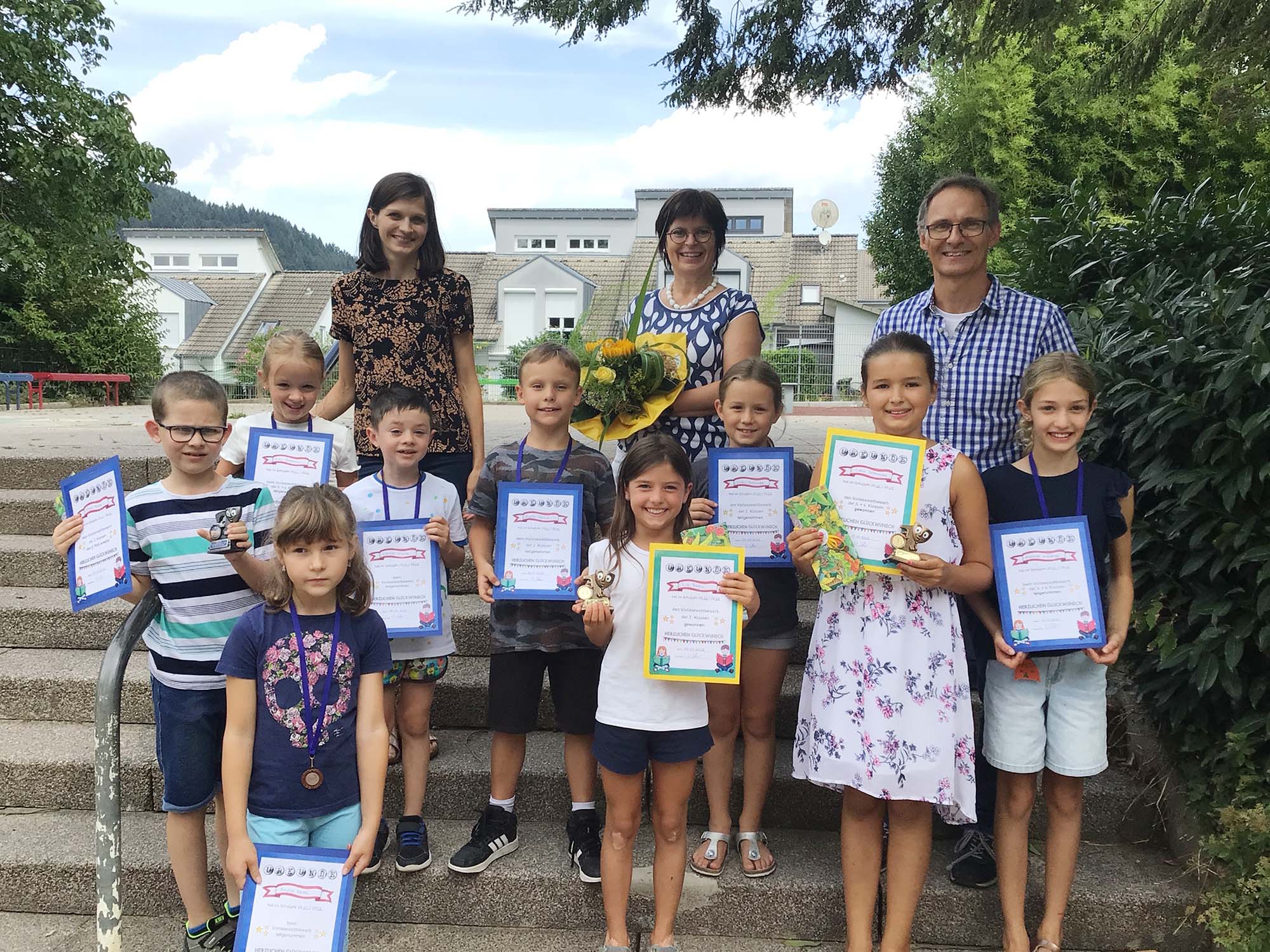 Zum Abschluss des Leseprojekts veranstaltete die Grundschule den alljährlichen Vorlesewettbewerb der Klassen 2 bis 4. Als das Lied „Lesen heißt auf Wolken liegen“ angestimmt wurde, lag Spannung in der Luft: Wer würde dieses Jahr wohl die begehrten Pokale und damit den Sieg mit nach Hause nehmen? Selbst die beiden Erstklässler Emilia Keidel und Lennox Charton bewiesen, dass sie zurecht ihr „Ich kann lesen“-T-Shirt an diesem Tag trugen. Mit einem selbst gewählten Buch traten die Kinder ab Klasse 2 in den Wettbewerb, der mit dem Vorlesen eines Fremdtextes endete. Fachkundig wurden sie dabei von einer dreiköpfigen Jury bewertet, die in diesem Jahr aus Petra Kühnpast (Buchhandlung Kopf), Tanja Singler (Deutschlehrerin) und Wolfgang Scharer (Konrektor) bestand. Am Ende des Schulvormittages standen die Leseköniginnen 2023 fest. Herzlichen Glückwunsch!