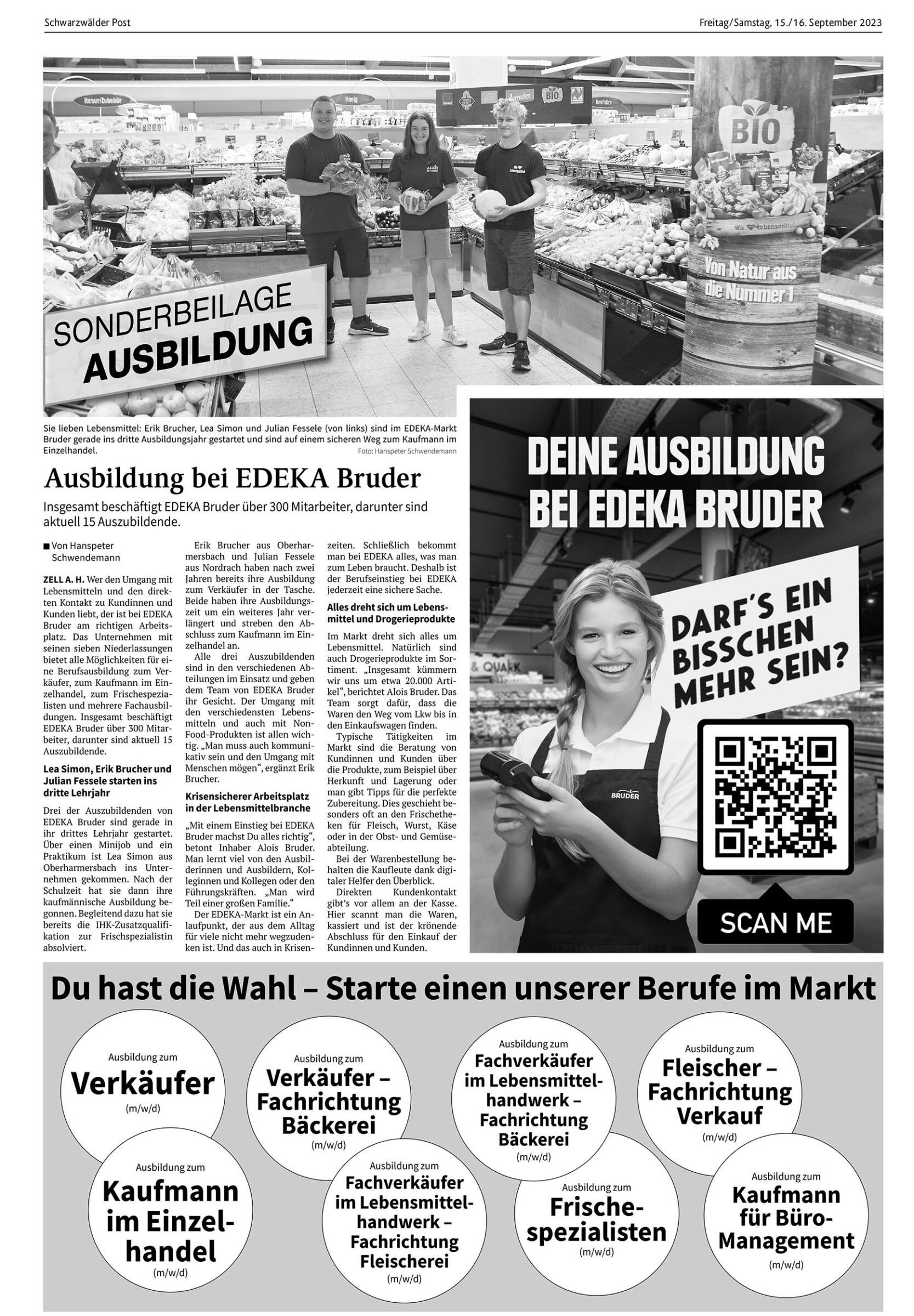 Sie lieben Lebensmittel: Erik Brucher, Lea Simon und Julian Fessele (von links) sind im EDEKA-Markt Bruder gerade ins dritte Ausbildungsjahr gestartet und sind auf einem sicheren Weg zum Kaufmann im Einzelhandel. Foto: Hanspeter Schwendemann