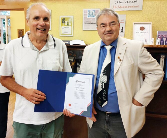 Michael Vollmer wurde vom Badischen Schachverband für 25 Jahre ehrenamtliche Tätigkeit ausgezeichnet. Die Laudatio für diese lange Tätigkeit im Ehrenamt übernahm Bezirksleiter und Vereinsvorstand Willi Eble im Rahmen der ersten Runde im Bezirkspokal gerne.