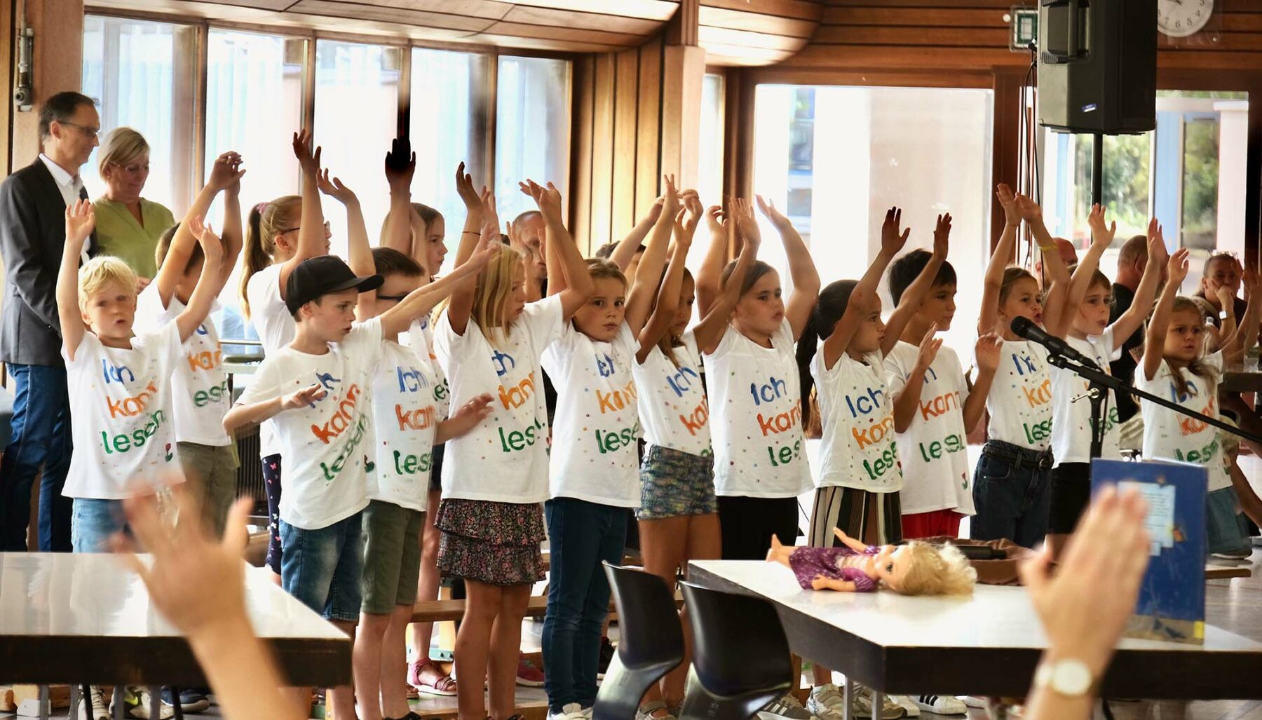 Grundschulleiter Wolfgang Scharer tritt im allgemeinen Trubel ans Mikrofon: „Wenn alle aufpassen, dann starten wir!“ Die Schüler der 2. Klasse haben sich etwas Besonderes ausgedacht. Sie singen und präsentieren das Buch „Der Ernst des Lebens“. Der Vortrag entpuppt sich als kleines Theaterstück. Die kleine Annette, eine fiktive Figur, wird von ihrem 5. Geburtstag bis zum ersten Schultag begleitet. Anfangs fürchtet sie „den Ernst des Lebens“, doch am Ende findet sie in der ersten Pause auch ihren ersten Schulfreund.