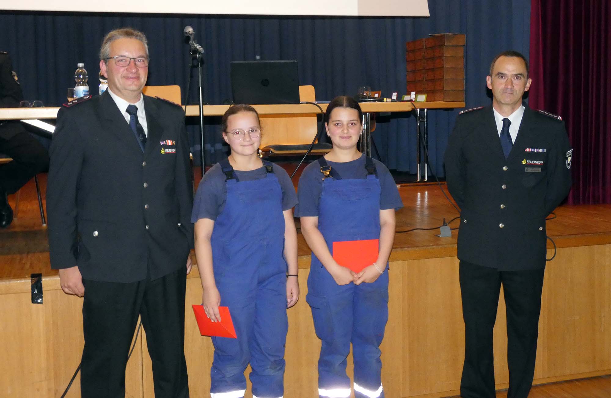 Und dann gab es da noch sehr junge Feuerwehrmenschen, die von Florian Lehmann auf oder vor die Bühne gerufen wurden. „Die wissen jetzt gar nicht, was auf sie zukommt“, stärkte der stellvertretende Kommandant mit einem aufmunternden Lachen zunächst zwei Mädchen auf ihrem Marsch nach vorne den Rücken: Emily und Dilana.