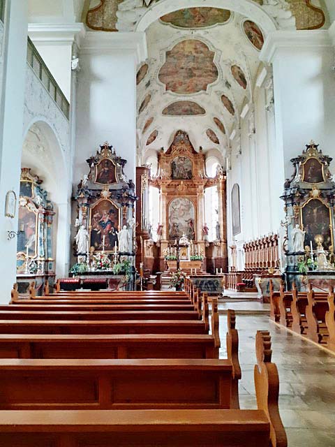 Nach einer kurzen Stärkung im Café und Gasthaus „Zum Kreuz“ stand die Besichtigung der Klosteranlage und der Kirche von St. Trudpert auf dem Programm. Lilo Schwarzer setzte ihre Ausführungen in der dreischiffigen Basilika fort, in der romanische, gotische und barocke Elemente aufeinandertreffen. Besonders beeindruckend: der prachtvolle Hochaltar aus Stuckmarmor, auf dem der Hl. Trudpert mit Trudpertkapelle und Trudperttanne zu sehen ist. Ebenso erklärte Schwarzer die Geschichte der Altäre sowie der Kanzel und der Chordecke mit dem Hauptdeckenfresko von Francesco Antonio Giorgioli. Die Hauptorgel gibt diesem Gotteshaus eine ganz besondere Note.